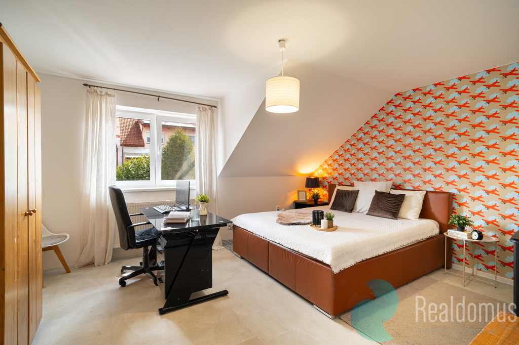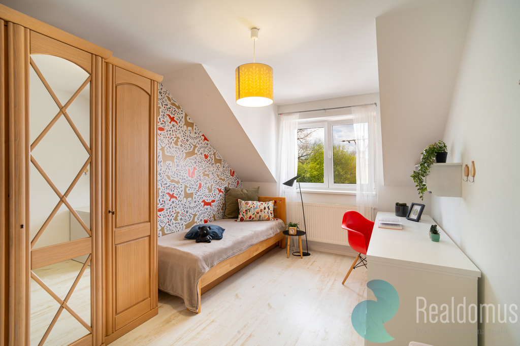 V horním patře se nachází tři samostatné pokoje, z nichž dva jsou orientovány do zahrady a jeden do ulice. Jeden z pokojů je také vybaven vestavěnou skříní. Dále je zde koupelna, samostatná toaleta a technická místnost, která prakticky doplňuje zázemí domu.