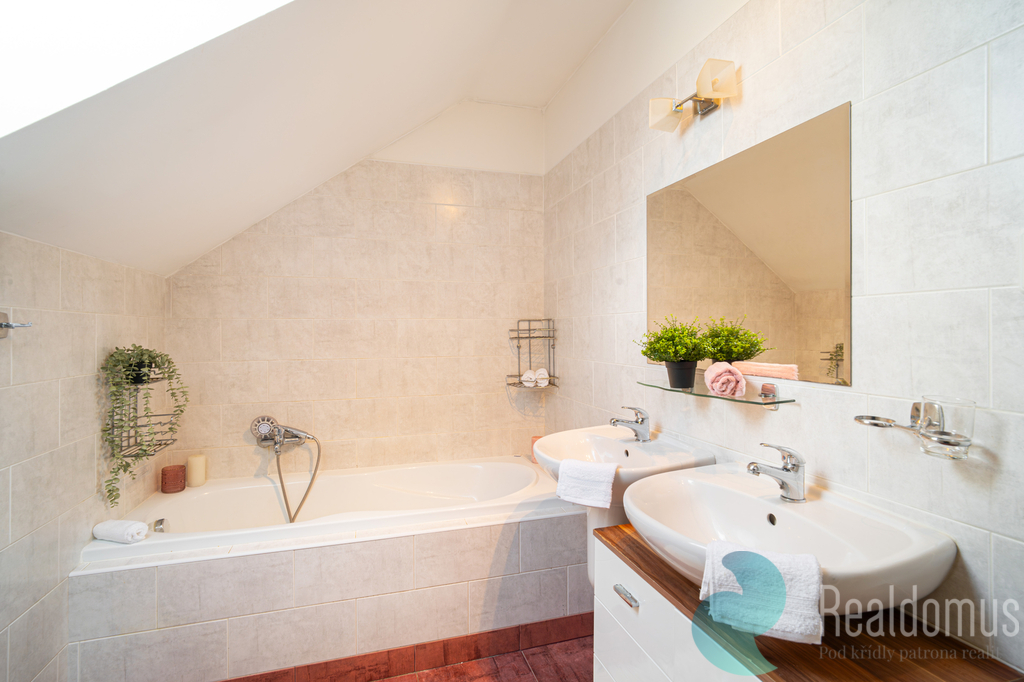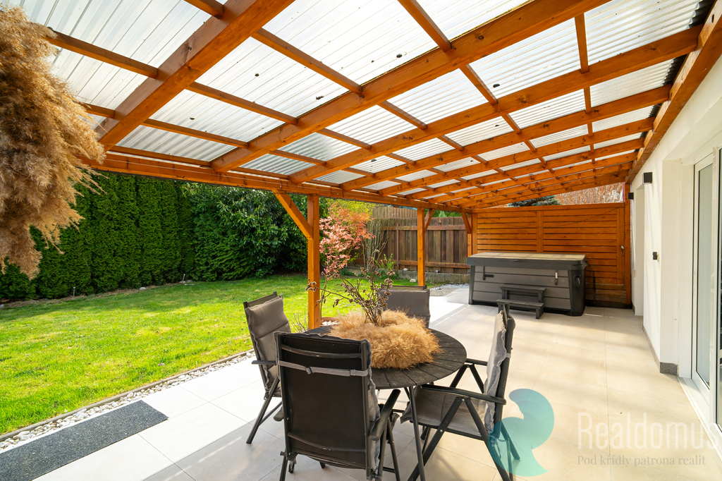 Srdcem domu je světlý obývací pokoj plynule propojený s kuchyní. Celý prostor působí velmi vzdušně a otevřeně a vytváří ideální místo pro rodinný život i setkávání s přáteli. Velké portálové dveře navazují na terasu se vstupem do zahrady, která nabízí příjemné soukromí a klid pro relaxaci. Součástí prodeje je také vířivka umístěná na terase, která ještě více podtrhuje komfort tohoto bydlení.