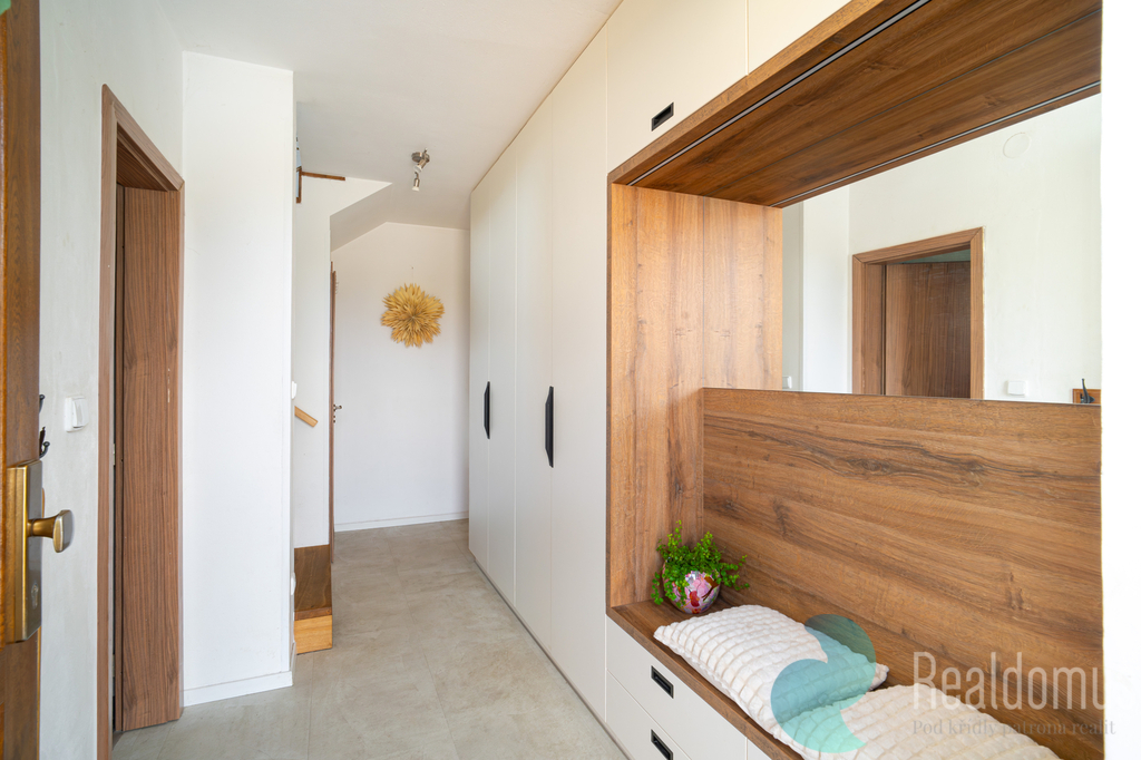 Dům je řešen jako patrový a vyniká promyšlenou dispozicí, která klade důraz na dostatek prostoru, soukromí i praktičnost každodenního provozu. Hned při vstupu je k dispozici předsíň s vestavěnými skříněmi nabízejícími dostatek úložného místa.