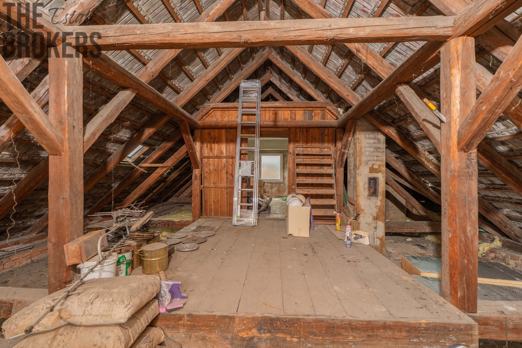 Kromě přízemní části se na půdě nachází jedna menší místnost o výměře cca 8 m². Tento prostor s výhledem do okolí je ideální jako dílnička, pracovna nebo kreativní koutek. Praktické zázemí domu doplňuje nádvoří, na kterém se nachází sklep a několik kůlen vhodných pro skladování materiálu či nářadí. Zahrada je od nádvoří oddělena opěrnou zdí a nachází se ve vyšší úrovni terénu.