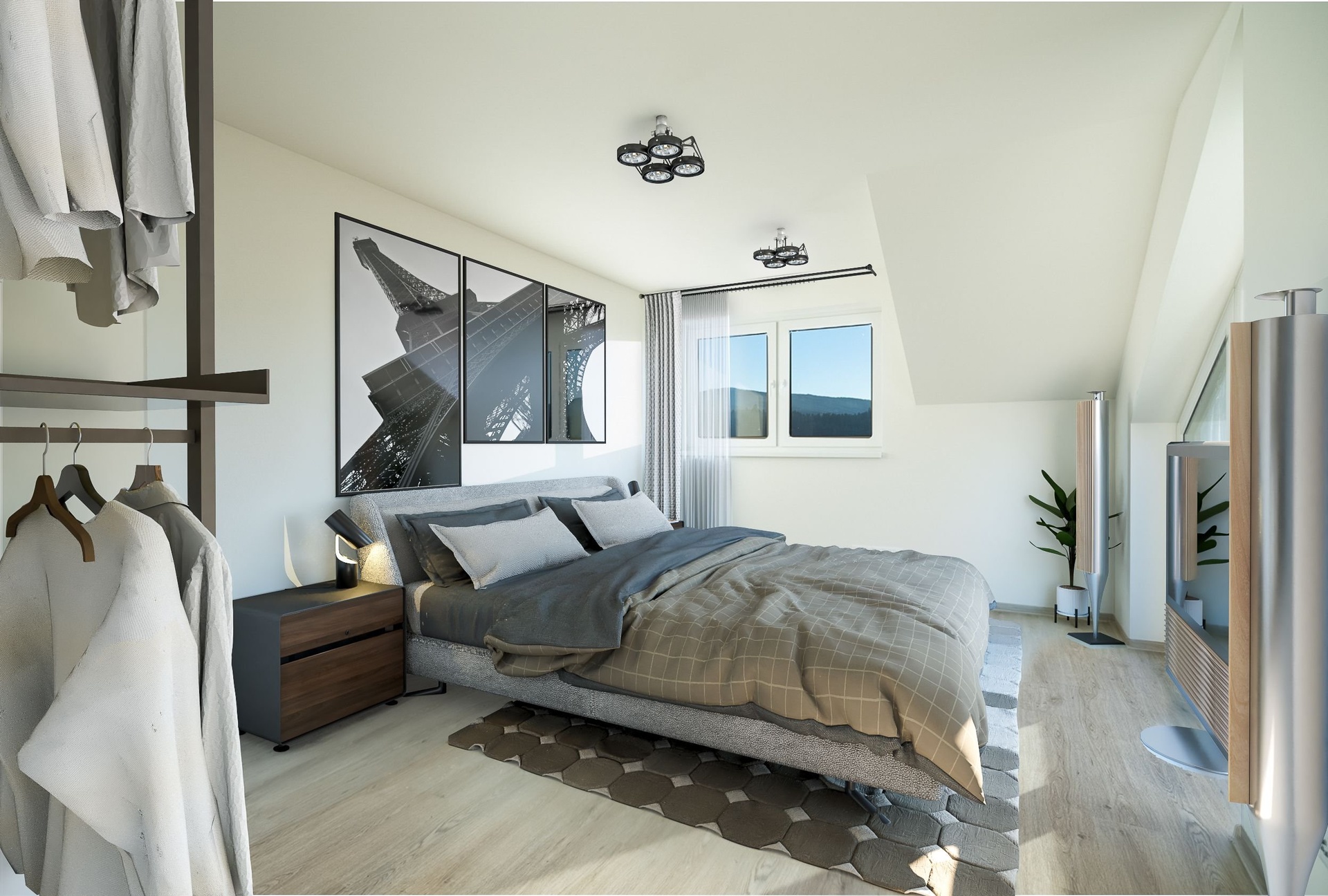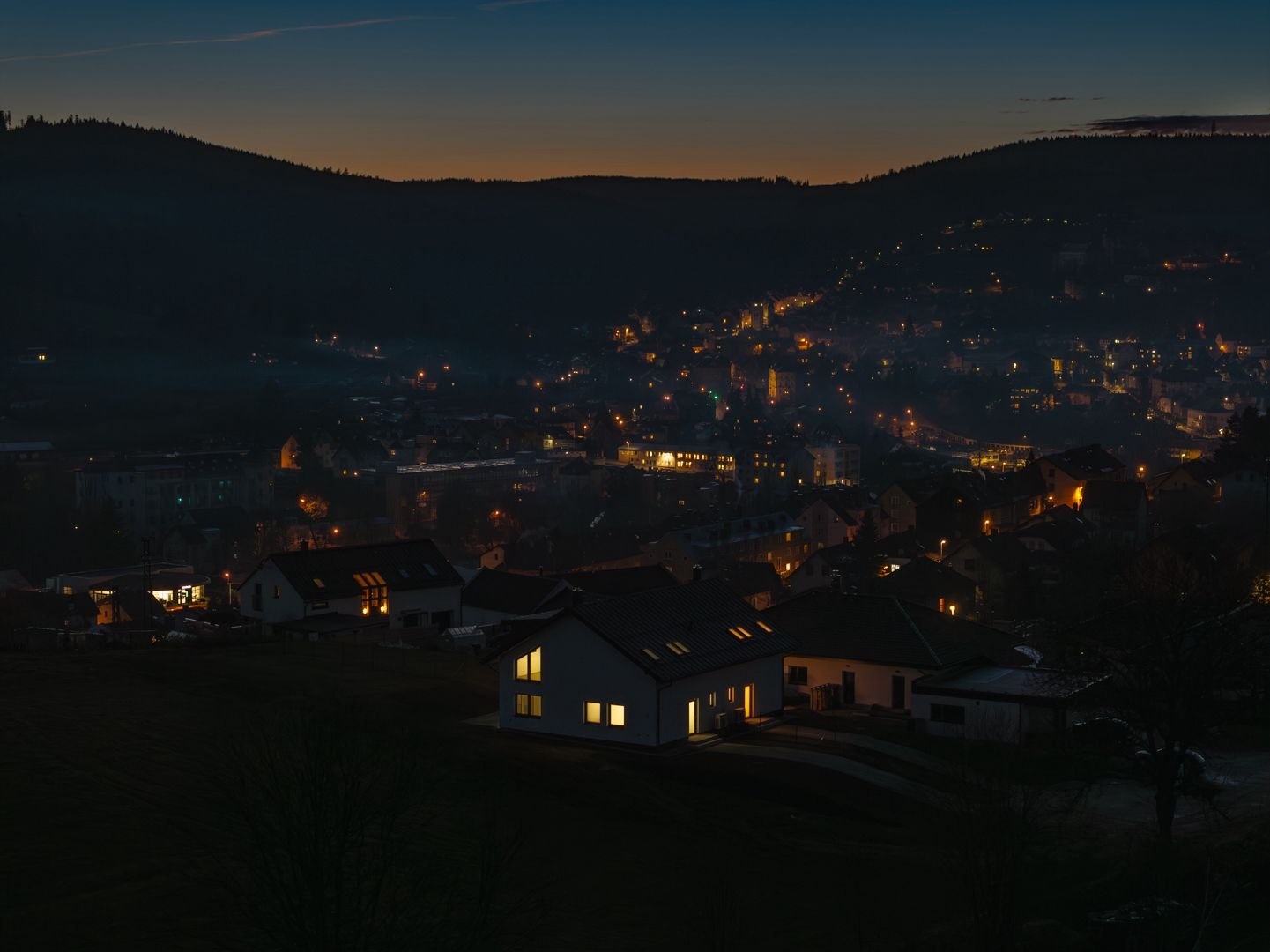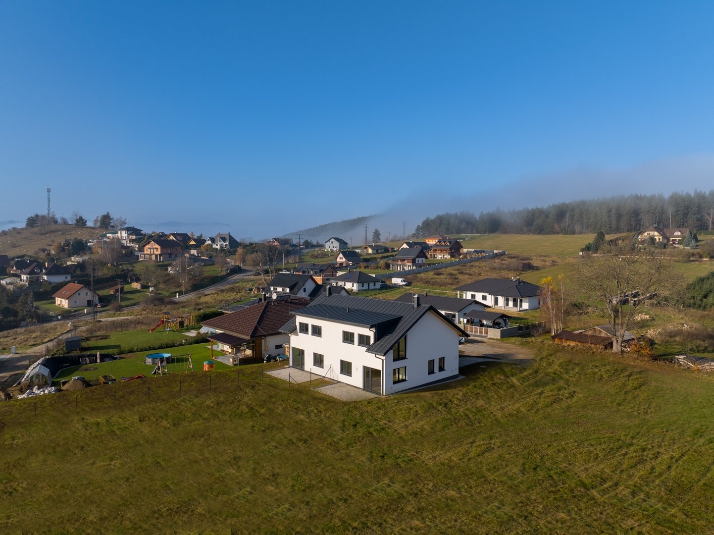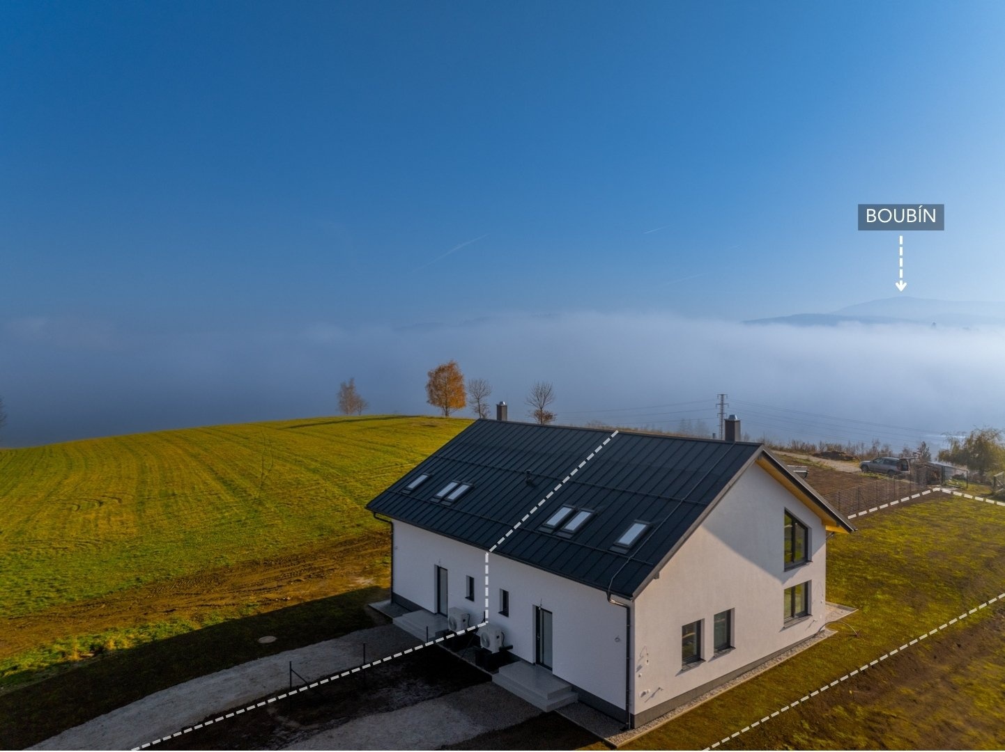 Dvojdům je navržený s důrazem na soukromí i pohodlí. Každá jednotka má vlastní kanalizační přípojku, vodoměr, podlahové vytápění v celém domě i přípravu pro fotovoltaiku. Tři pokoje mají výhled přímo na Boubín a jeden z nich – díky lomeným oknům – nabízí navíc panorama Vimperka. Místo, kde ráno začíná světlem a tichým výhledem do zeleně.