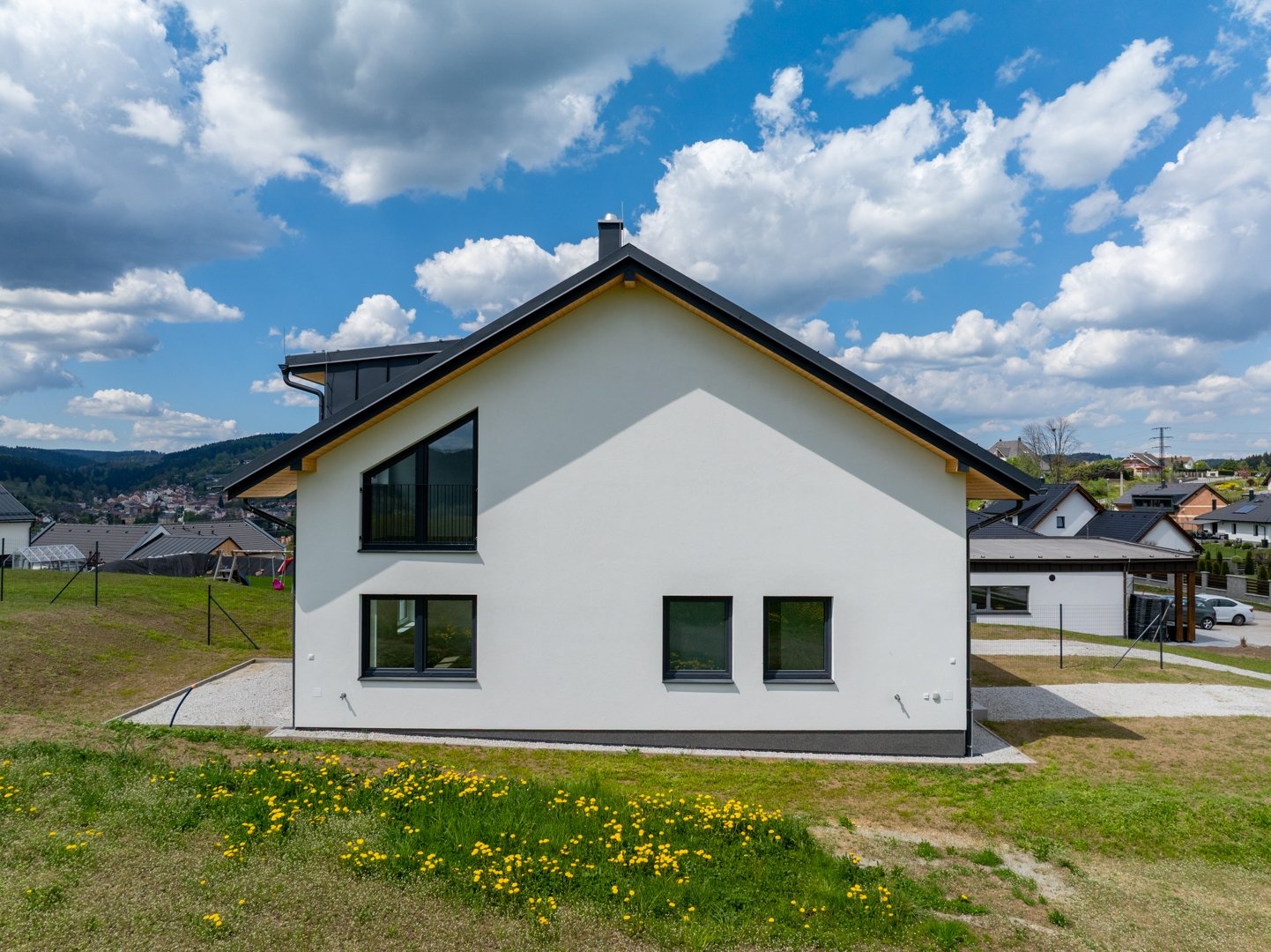 - Úsporný provoz díky tepelnému čerpadlu, retenční nádrži a přípravě na fotovoltaiku.