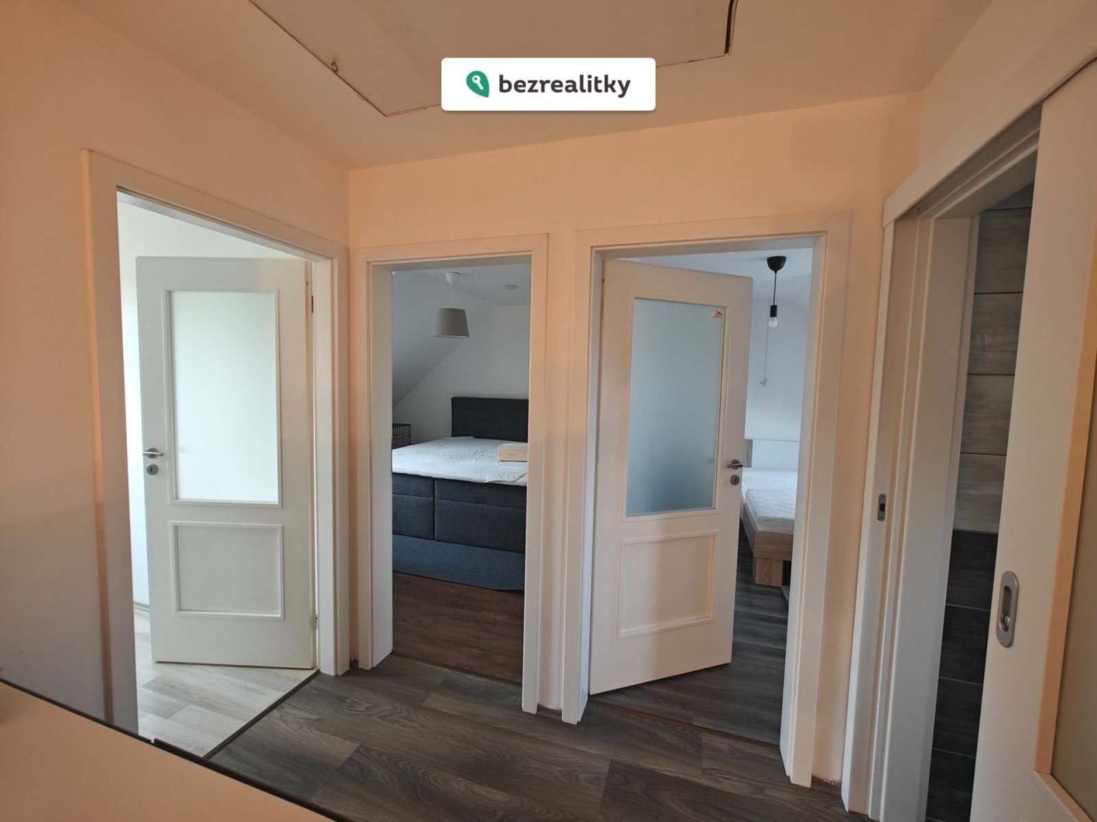 V patře je druhá koupelna s vanou a tři samostatné pokoje, včetně dvou nových postelí. K dispozici je také praktický úložný prostor v podkroví.