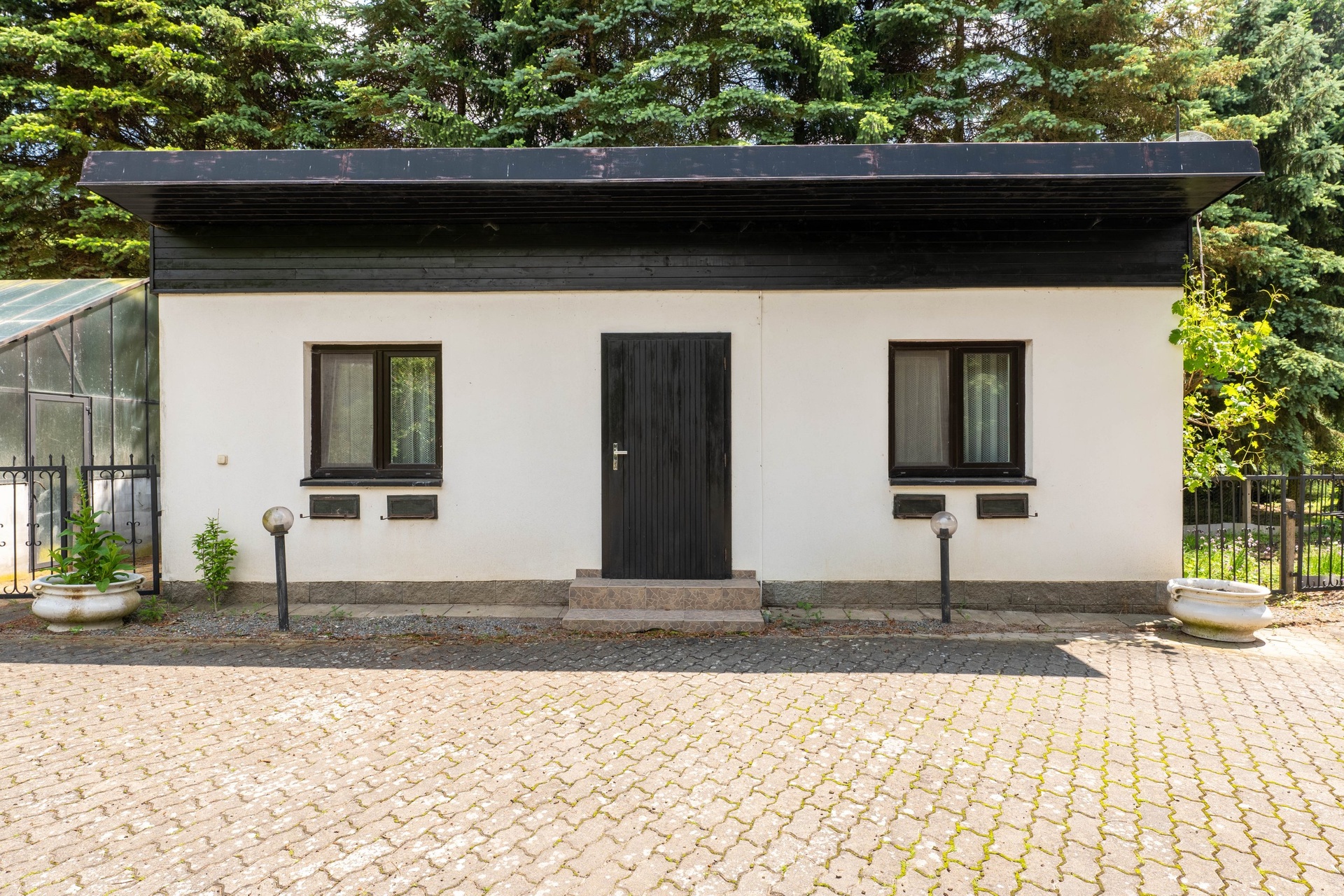 Hlavní dům disponuje třemi pokoji, kuchyní, společenskou místností a bazénovou halou. Je zde také možnost rozšíření o půdní vestavbu. Dále se na pozemku se nacházejí dva hostinské domy. První dům má dispozici 2+kk s vlastním sociálním zařízením, dílnou a černou kuchyní/přípravnou. Druhý nabízí dva pokoje a koupelnu s WC. Další vybavení zahrnuje stylové kryté posezení s krbem, grilem a udírnou. Samozřejmostí je kryté parkovací stání pro více aut a dále skleník.