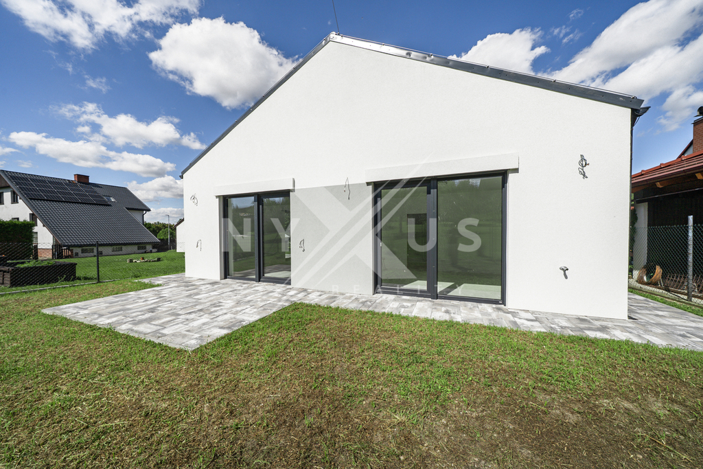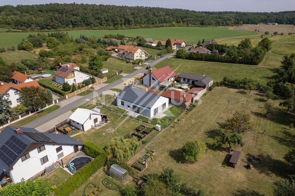 Vytápění je řešeno formou podlahového topení, z ložnice a obývacího pokoje přímý vstup na zahradu (HS portály - posuvné dveře), příprava na tepelné čerpadlo, příprava na venkovní předokenní rolety, komín s přívodem externího vzduchu pro krb. Osvětlení řešeno formou LED zdrojů. Na zahradě je zabudována nádrž pro dešťovou vodu o objemu 8m3 s vysokotlakým čerpadlem. Dům je napojen na elektřinu, namontován elektroměr, vodu, namontován vodoměr a kanalizaci namontována přečerpávací šachta. Smlouvy na odběry energií jsou uzavřeny.