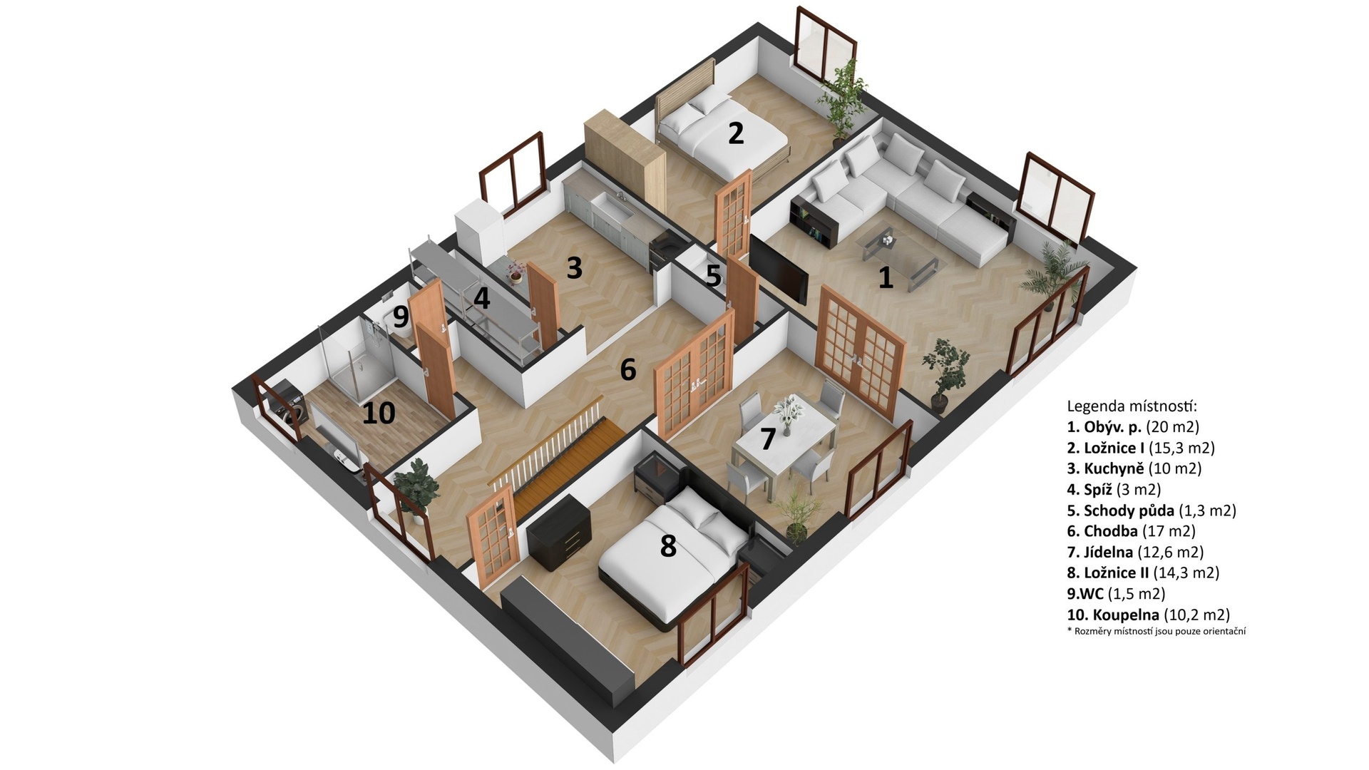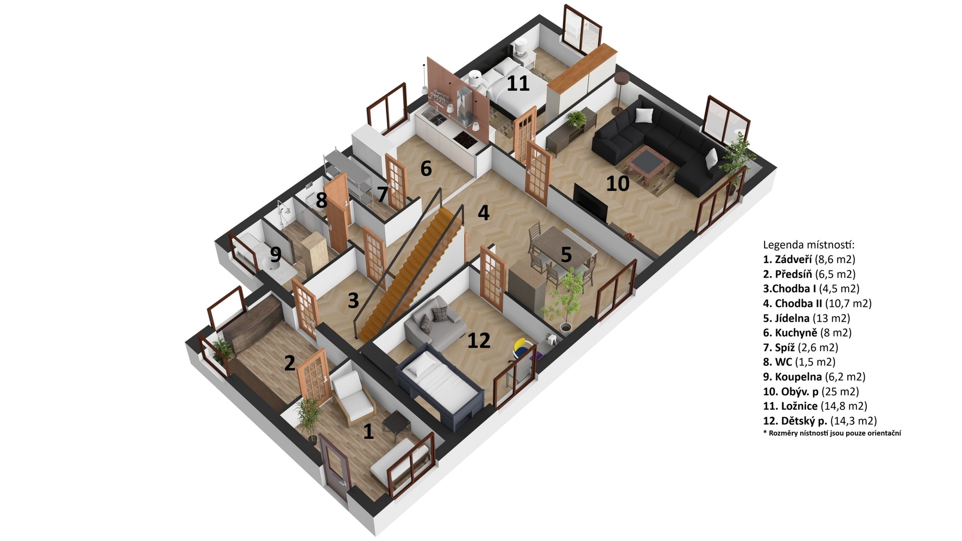 - Užitná plocha cca 225 m², praktické členění, dostatek úložných prostor