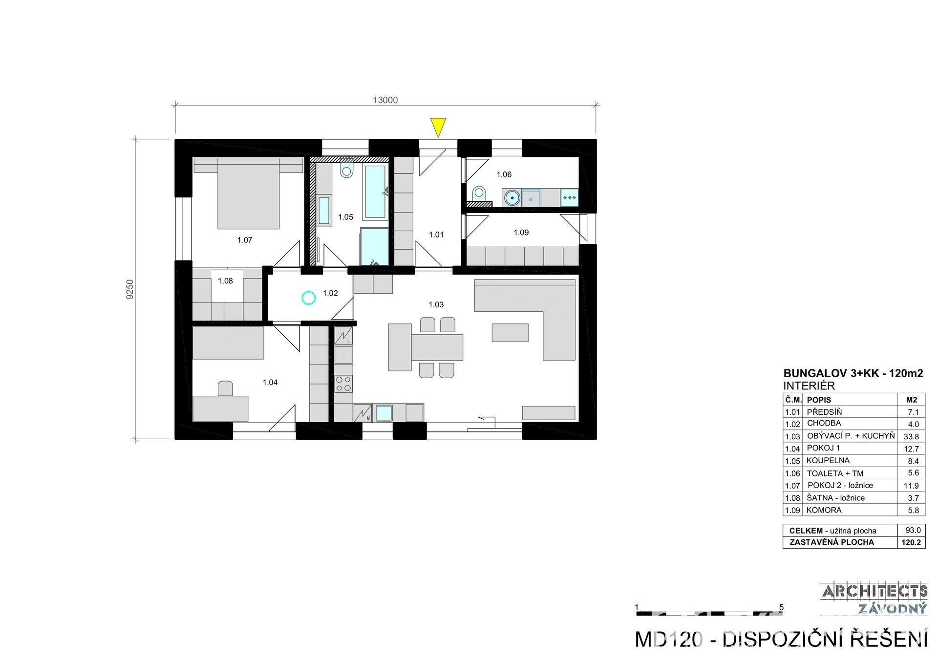 Technické parametry: dispozice 3+kk, užitná plocha 93 m², zastavěná plocha 120,2 m², přízemní, bezbariérové řešení, šikmá střecha, samostatná technická místnost, tepelné čerpadlo Vaillant a v ceně je také podlahové vytápění v celém domě.