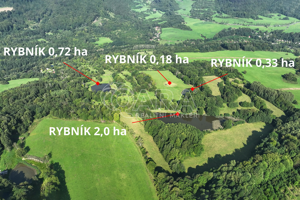 Pozemek A - 4 rybníky o velikosti celkem 3,2 ha, sady a pastviny o celkové výměře 20 ha, které nabízejí neomezené možnosti chovu ryb, sportovního rybolovu a chovu ovcí a skotu.