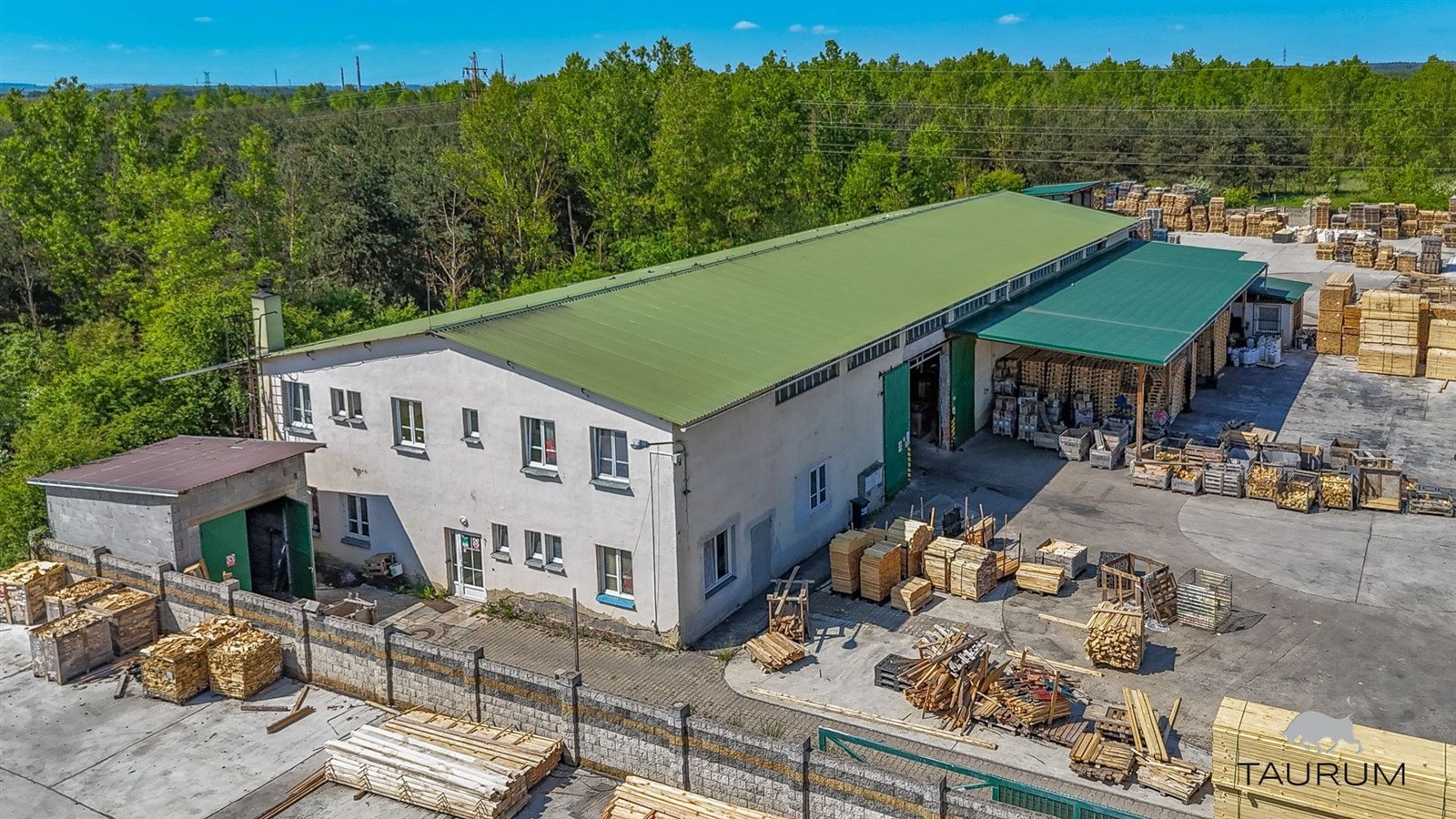 Dále jsou na pozemku přístřešky tmavě zelené plochy na fotce z dronu. Před vjezdem do hlavního pozemku jsou na levé i pravé straně samostatné oplocené pozemky.