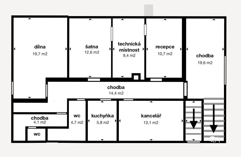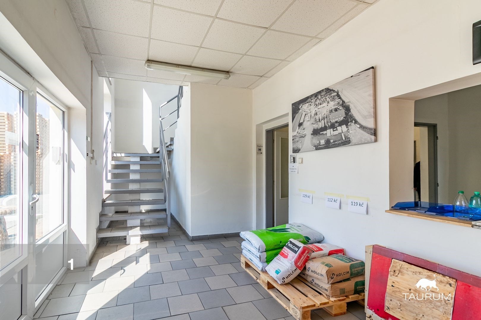 1 dvoupodlažní částečně podsklepená zděná administrativní budova s kancelářemi a zázemím (šatny, sprcha, wc, kuchyňka) o celkové podlahové ploše 285 m2, budova je ve vynikajícím stavu