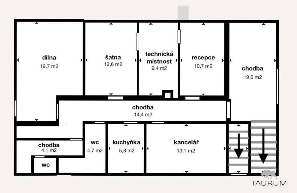 1 dvoupodlažní částečně podsklepená zděná administrativní budova s kancelářemi a zázemím (šatny, sprcha, wc, kuchyňka) o celkové podlahové ploše 285 m2, budova je ve vynikajícím stavu
