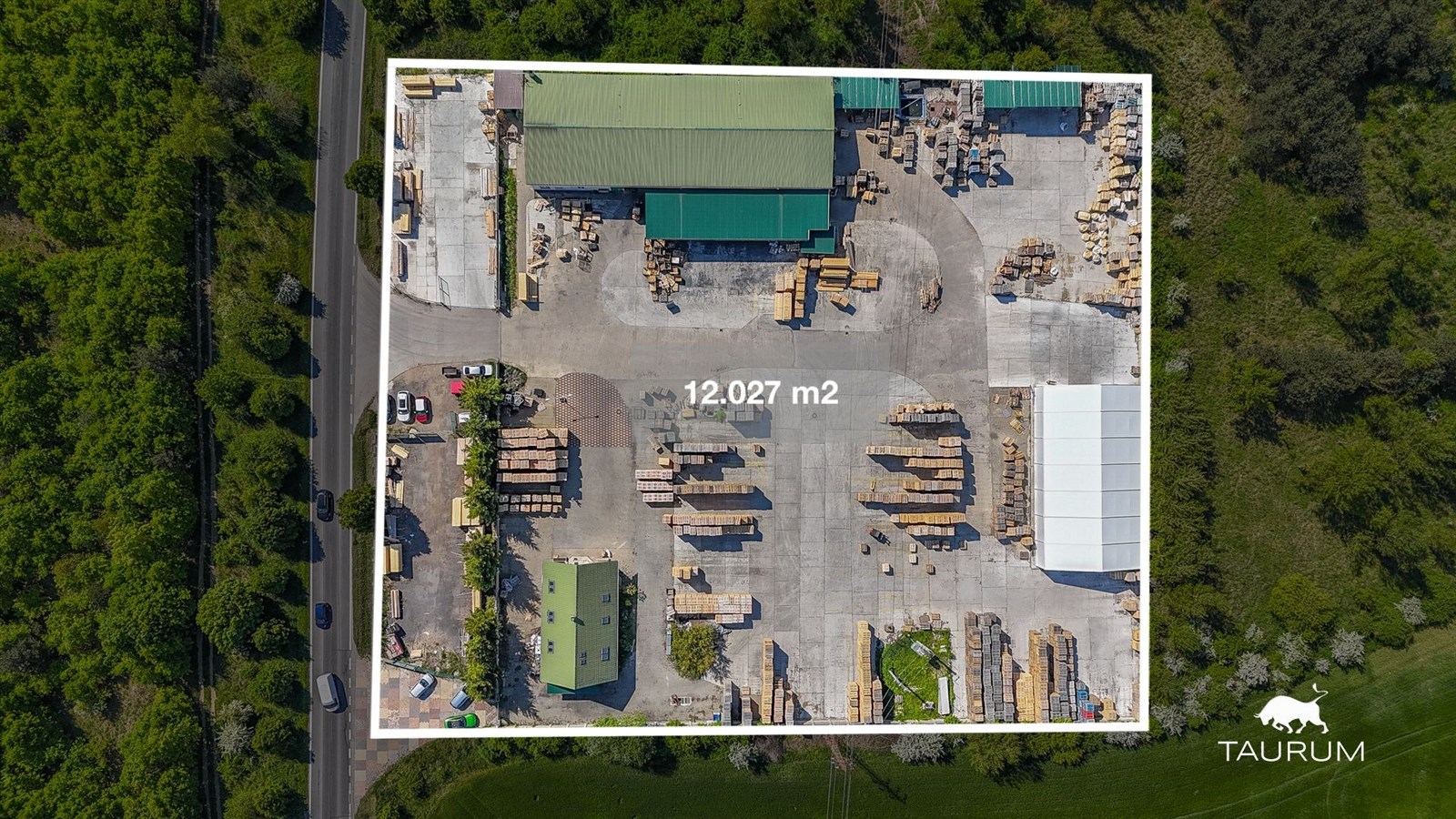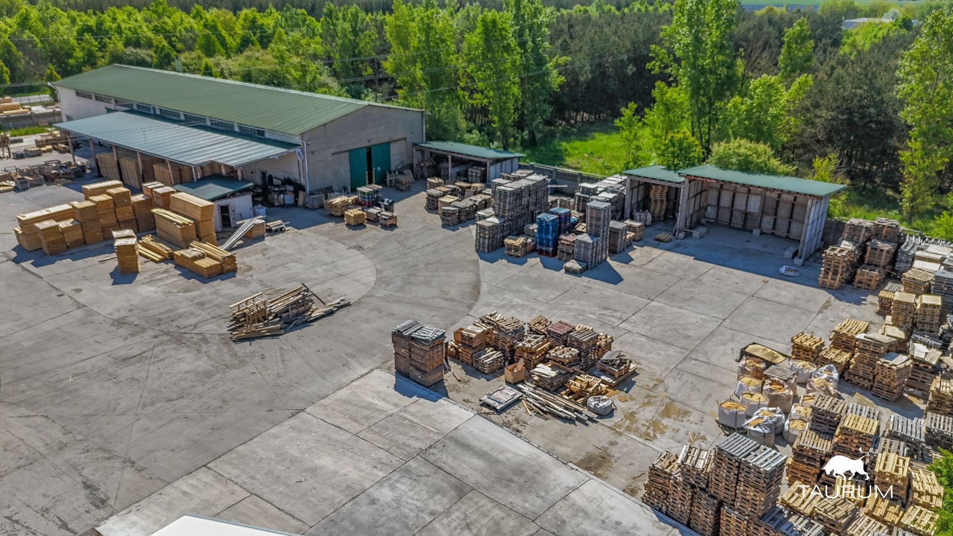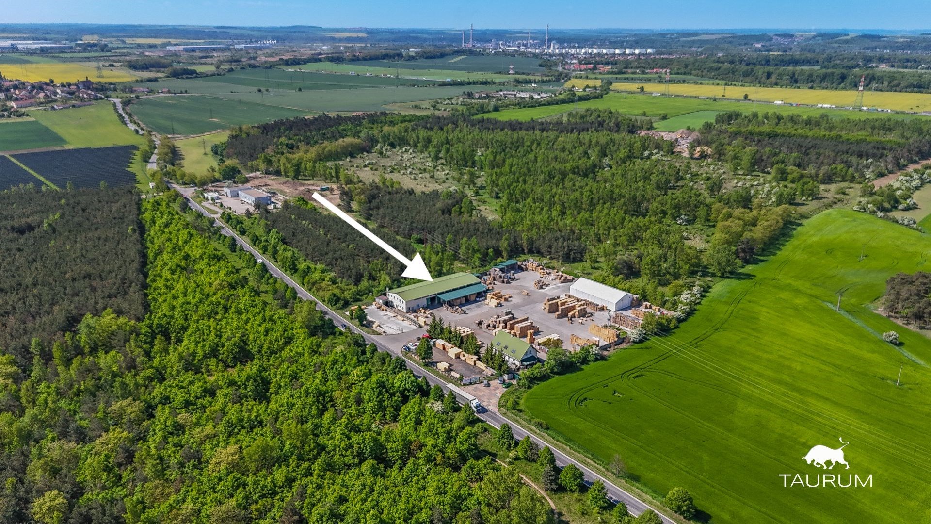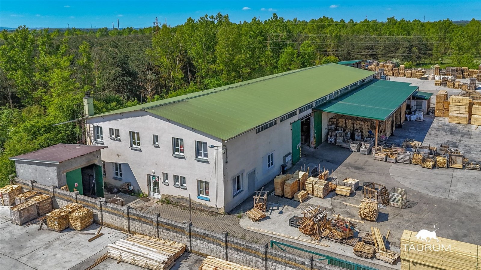 Dále jsou na pozemku přístřešky tmavě zelené plochy na fotce z dronu. Před vjezdem do hlavního pozemku jsou na levé i pravé straně samostatné oplocené pozemky.
