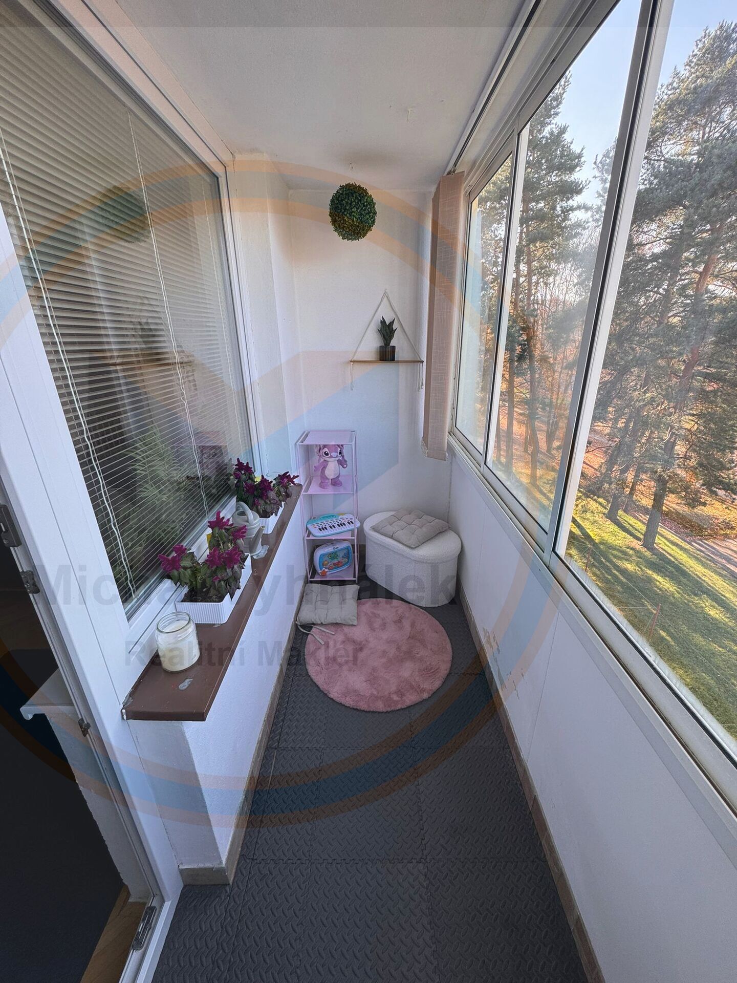 Dva průchozí pokoje, každý s vlastní zasklenou lodžií se žaluziemi.