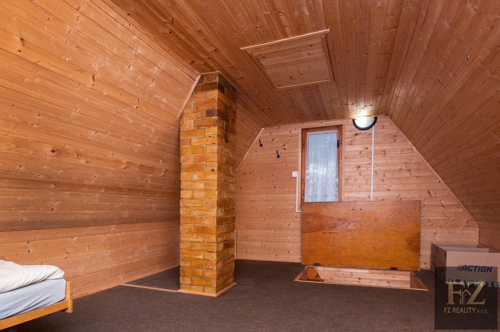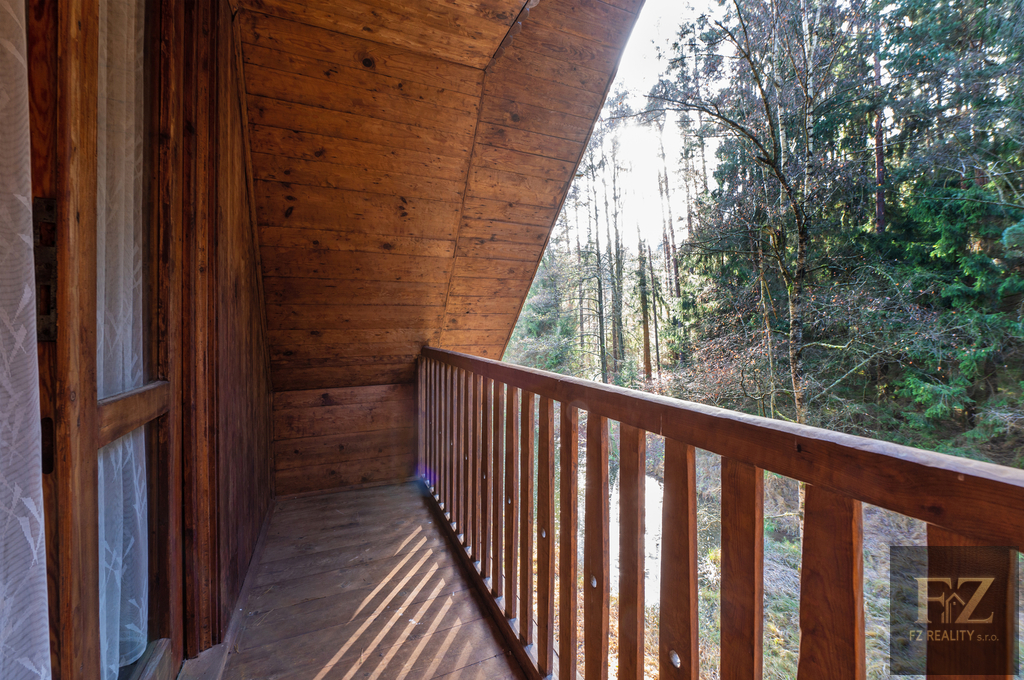 Uvnitř chaty se nachází vstupní veranda, ze které vstoupíte do obývací místnosti s kuchyňským koutem. Součástí vybavení je dřez, lednice a elektrická stolní trouba s plotýnkami. V přízemí se nachází WC s umyvadlem a přípravou na sprchový kout. V patře je ložnice se dvěma lůžky a balkonem s krásným výhledem na rybník a okolní lesy.
