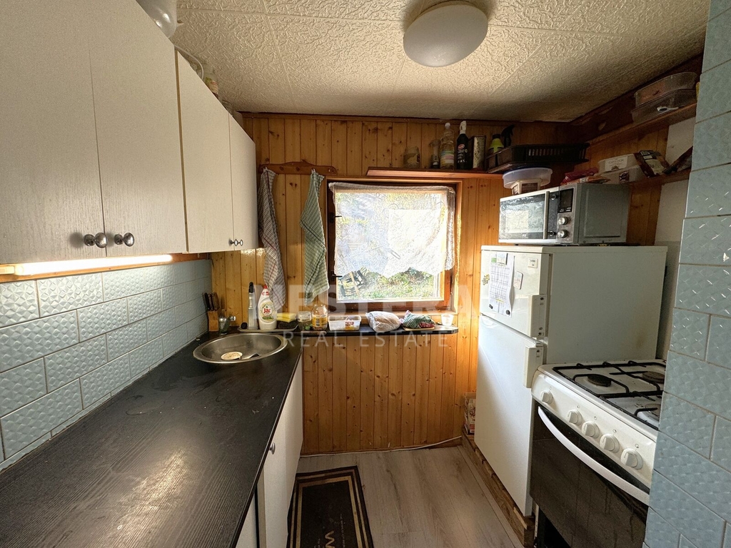Ve spodním patře najdete vstupní předsíň (verandu), menší chodbičku se schodištěm, prostornou obývací místnost s kamny a výhledem do zahrady, kuchyňku a koupelnu se sprchovým koutem a toaletou. Druhé podlaží patří velkorysé podkrovní ložnici, odkud je krásný výhled do zeleně a na vodní nádrž Vrané. Další (suchá) toaleta je na zahradě. Praktickým úložným prostorem je velký sklep, kde je umístěn bojler pro ohřev teplé vody a je zde možné ukládat například zahradní nářadí.