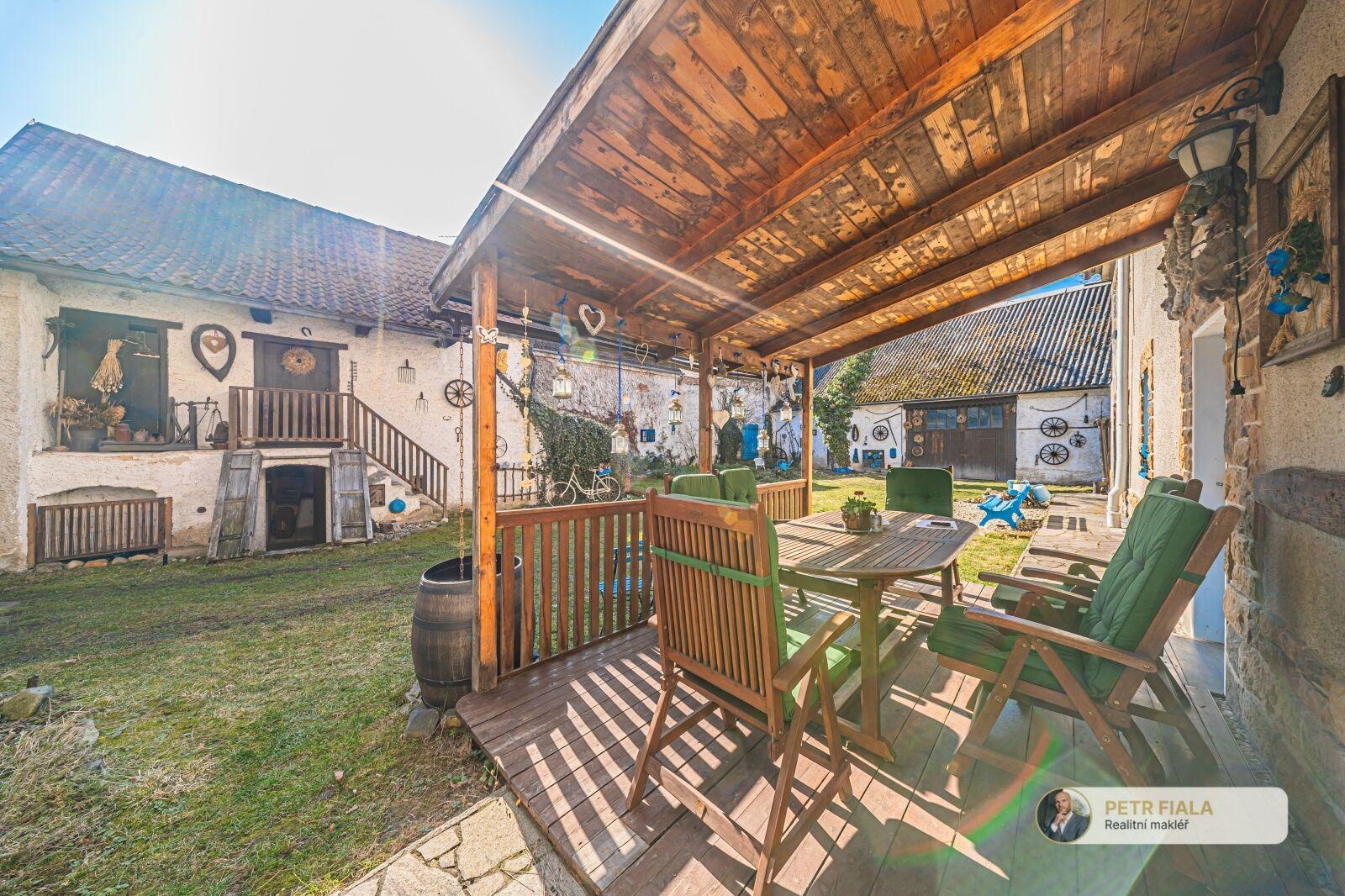 Dvůr doplňují dřevník, terasa s posezením, vlastní studna a jímka na dešťovou vodu.