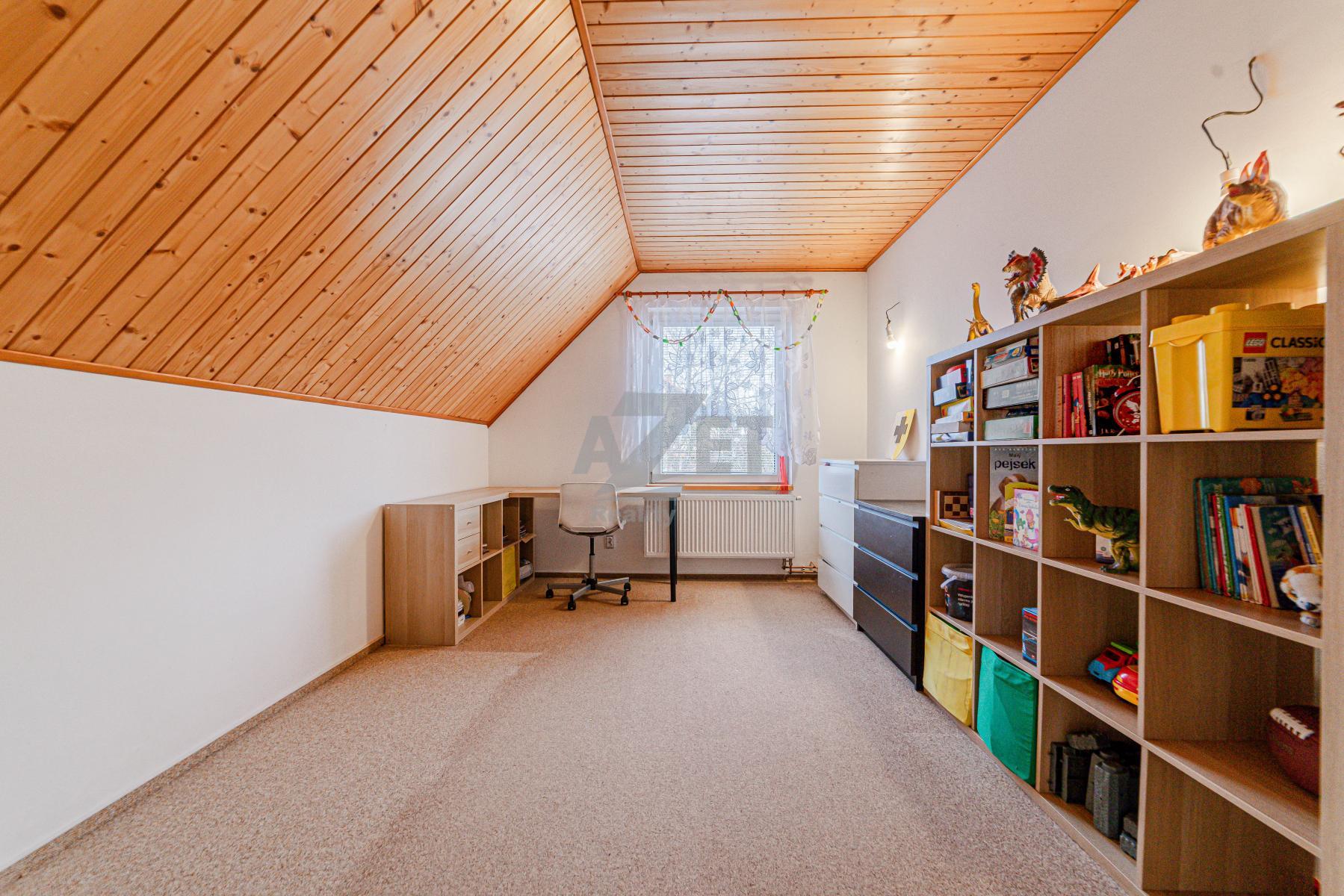 2.NP - 100,61 m2 - hala se schodištěm, dva dětské pokoje, ložnice, pokoj nyní sloužící jako třetí dětský pokoj - původně koupelna s wc, místnost lze opětovně předělat a úložné prostory v šikminách střechy