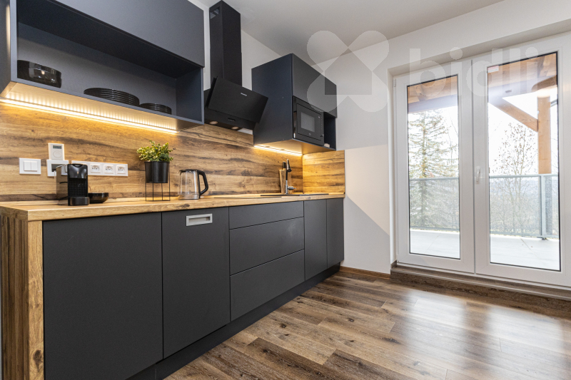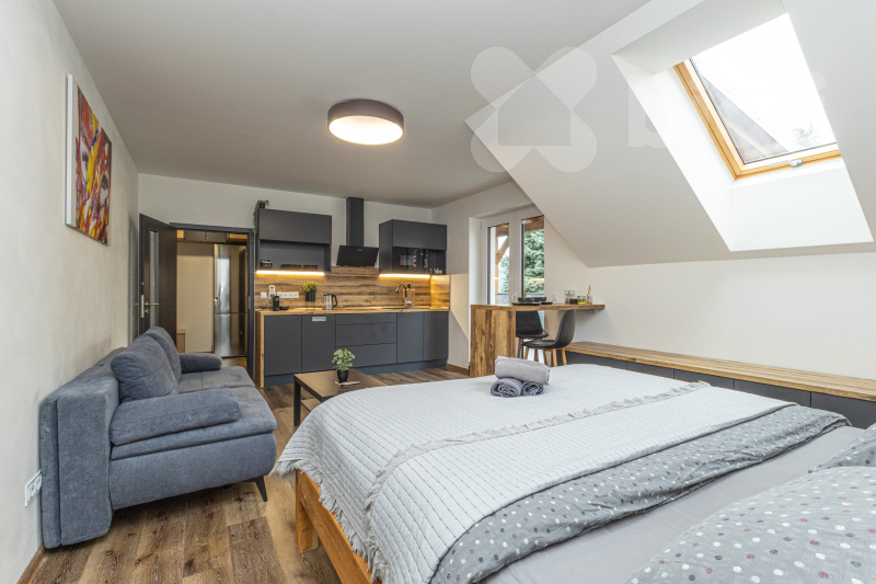 Obývací pokoj a kuchyňský kout - skříňky na míru, stůl a rozkládací sedací souprava, vstup na terasu, dominantou pokoje je manželská postel, nad kterou je střešní okno. Plně vybavená kuchyňská linka (vestavná kombinovaná mikrovlnná trouba s grilem, myčka, varná deska, odsavač par). Celková kapacita apartmánu je až 4 osoby, popřípadě lze přidat i přistýlku, což představuje ideální příležitost pro investici do rekreačního bydlení v oblíbené lokalitě Jeseníků.