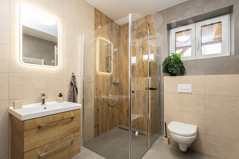 Koupelna s WC - sprchový kout, elektrický žebřík, prostor pro pračku a bojler