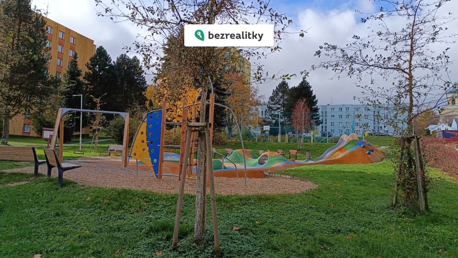 Před domem je nové parkoviště a moderní dětské hřiště.