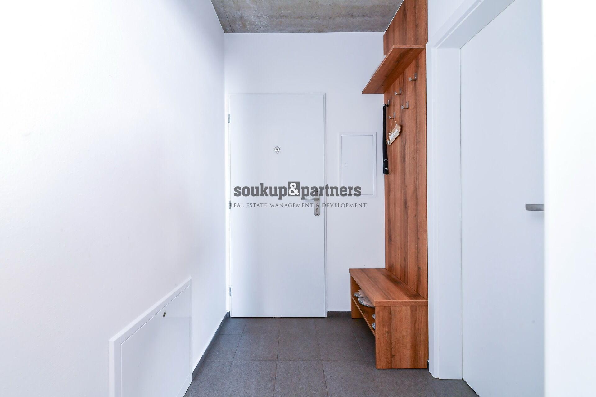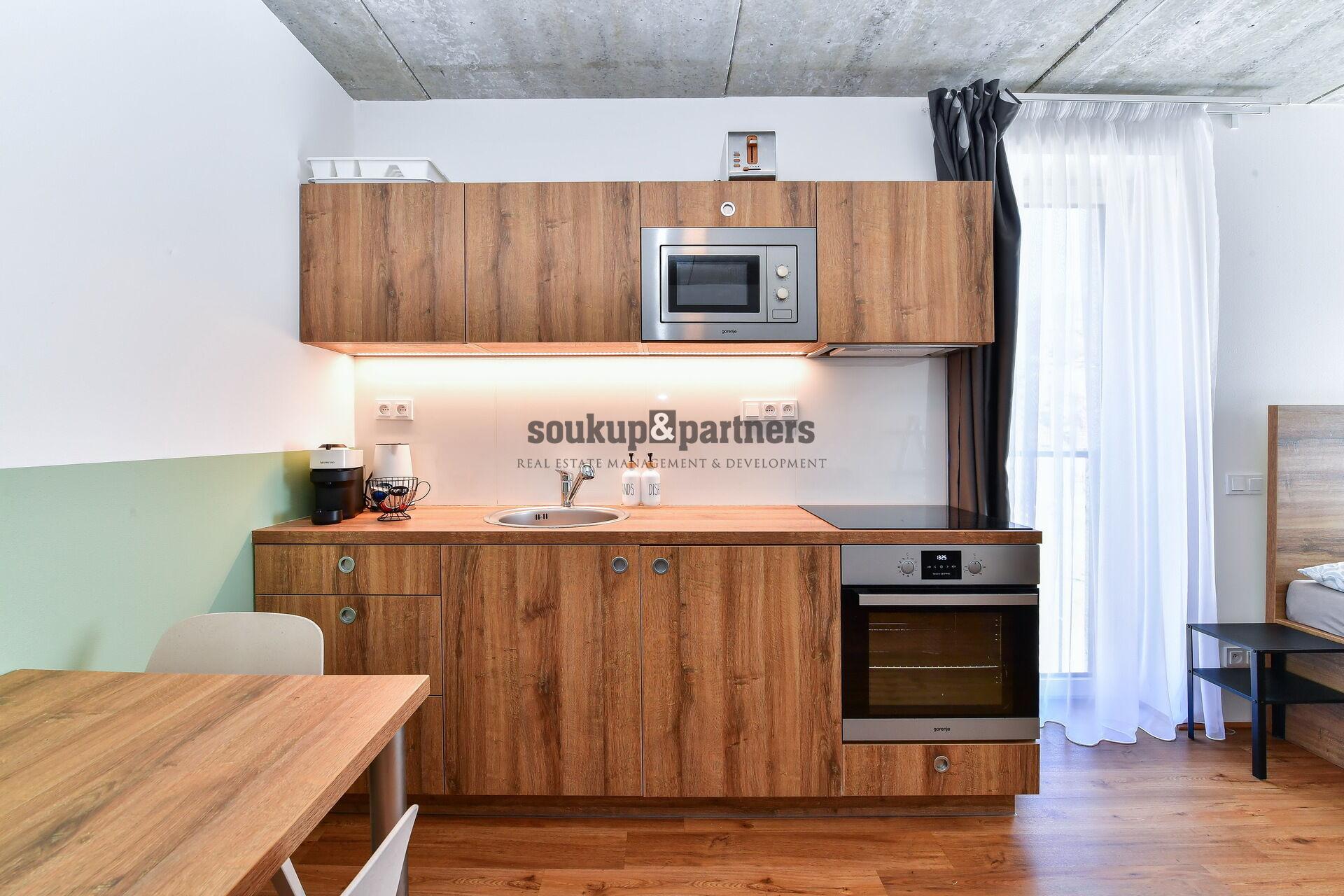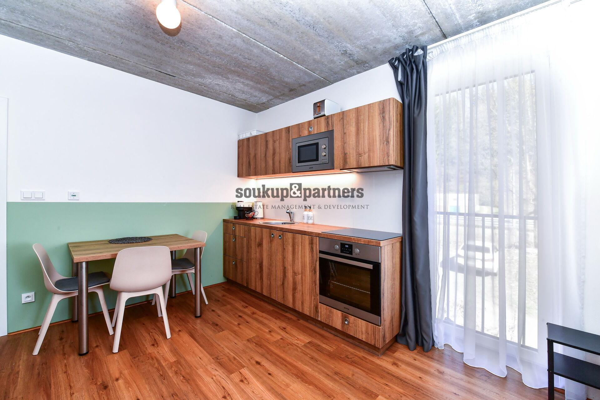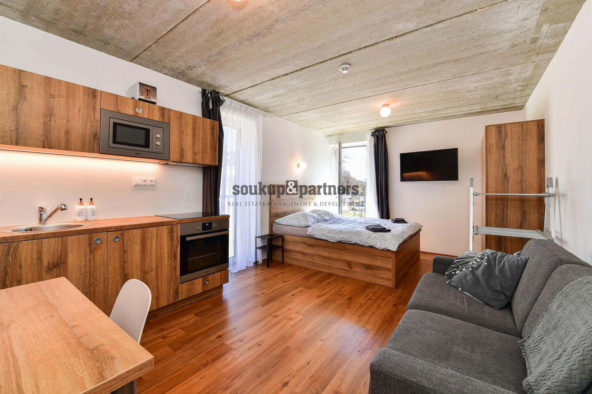Byt je kompletně vybaven - vinylové podlahy, kuchyňská linka vč. vestavěných spotřebičů, jídelní stůl vč. židlí, manželská postel vč. matrací, rozkládací gauč s integrovanou matrací, šatní skříň, TV sušák na lyžařské vybavení, koupelna se sprchovým koutem, otopným žebříkem, umyvadlem a přípojkou na pračku, obklad v dekoru Betonico. V bytě jsou stropy z pohledového betonu, což dodává prostoru moderní styl. Mezi dalším vybavením jsou částečně čidla na světla, zabezpečovací zařízení a podlahové vytápění.
