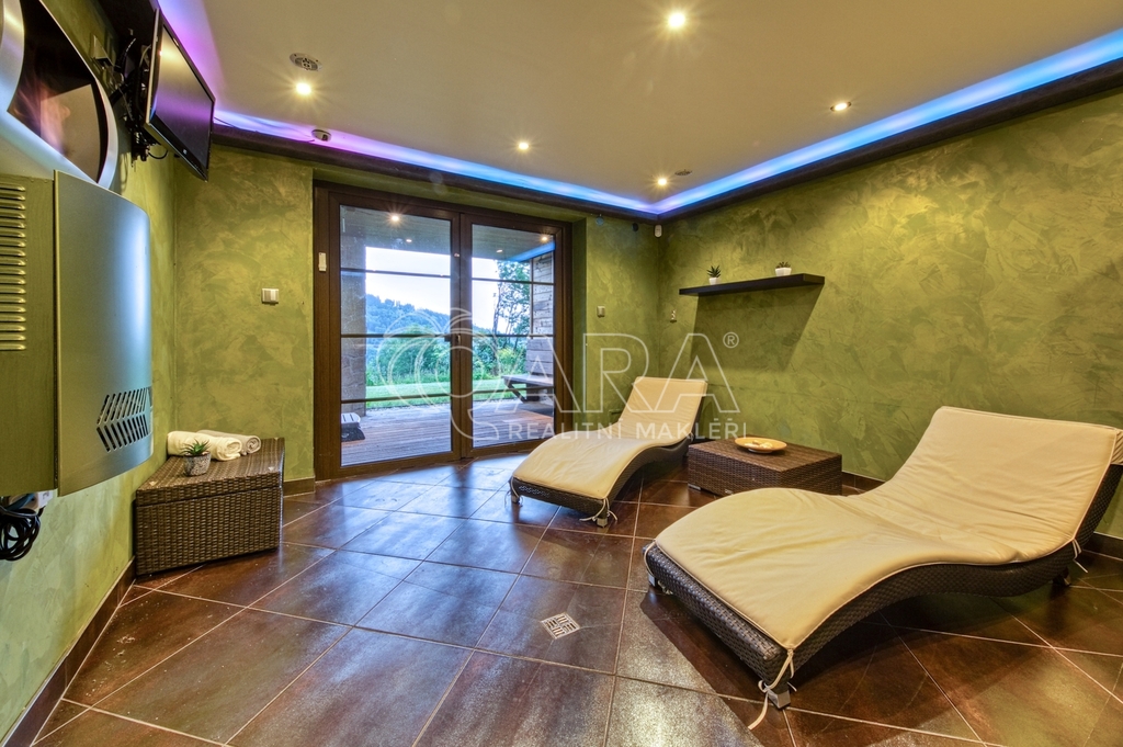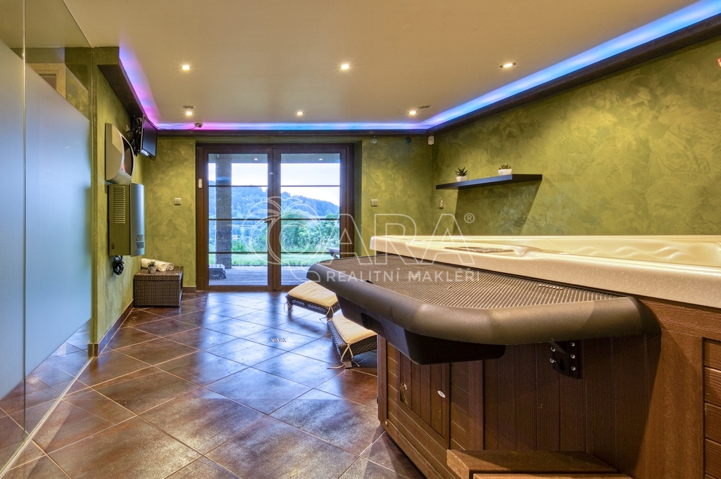 Interiér je řešen velkoryse s důrazem na komfort a prostor, k dispozici je vnitřní i venkovní wellness zóna se saunou a vířivkou, prostorná terasa s posezením, venkovní ohniště a praktické zázemí šatny a lyžárny.