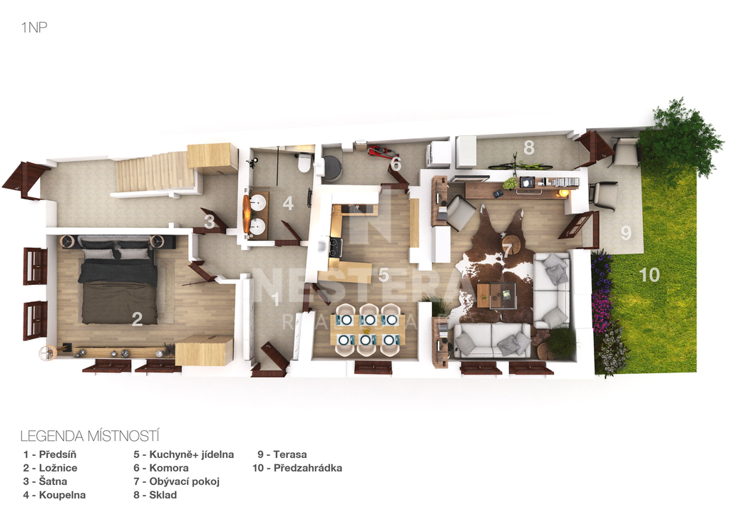 1.NP má obytnou plochu 86 m² je zde navržen byt o dispozici 2+1 s přímým vstupem na menší zahrádku.