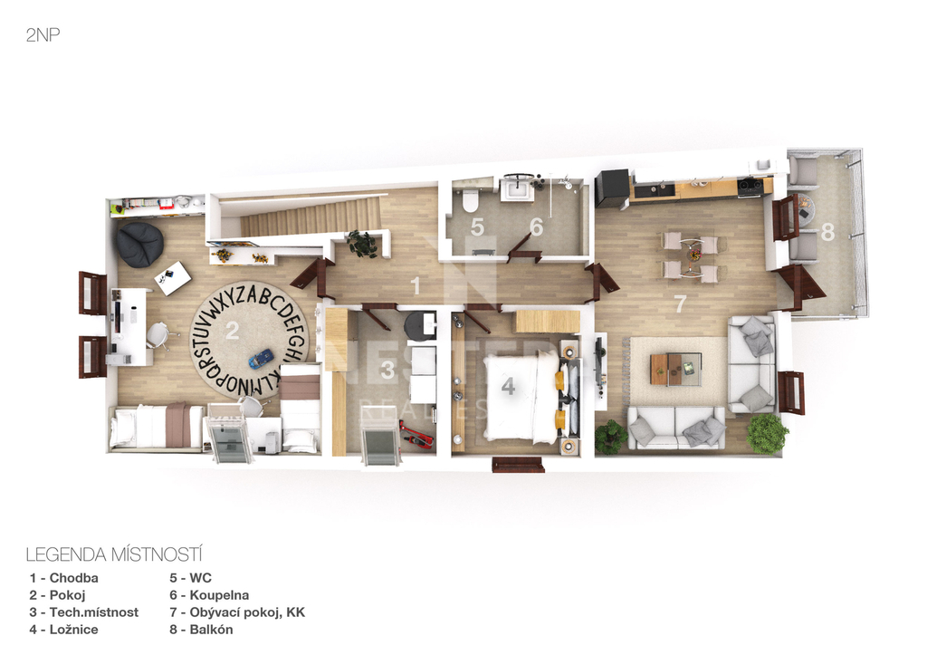2. NP má obytnou plochu 88 m² a lze zde vytvořit byt o dispozici 3+kk, doplněný o balkon o ploše 5,5 m², který nabízí příjemné místo pro ranní kávu s výhledem do zeleně.