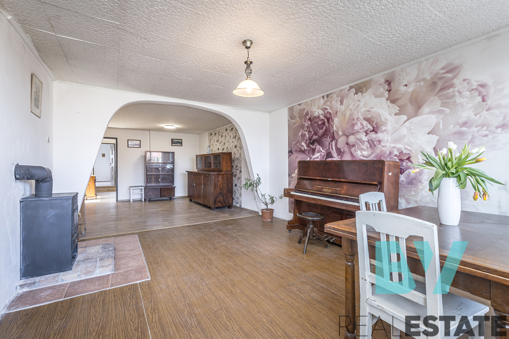 Dům nabízí praktické rodinné bydlení s dostatkem zázemí i úložných prostor. Dispozici tvoří prostorný obývací pokoj s jídelnou a krbovými kamny se vstupem na terasu a do zahrady, kuchyň, dva dětské pokoje, ložnice, koupelna s vanou, samostatné WC a zádveří se vstupem do garáže.