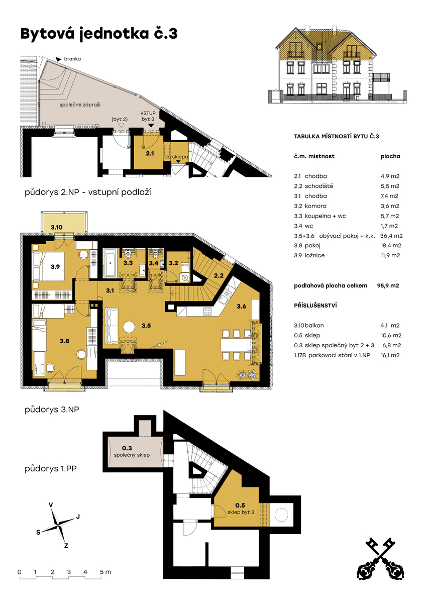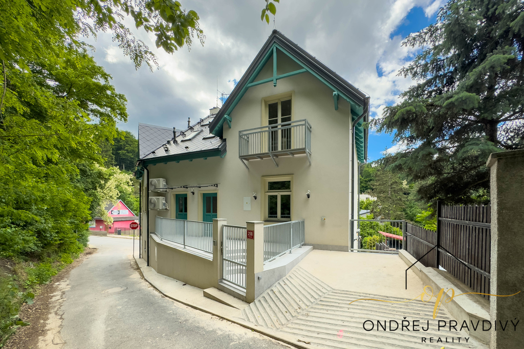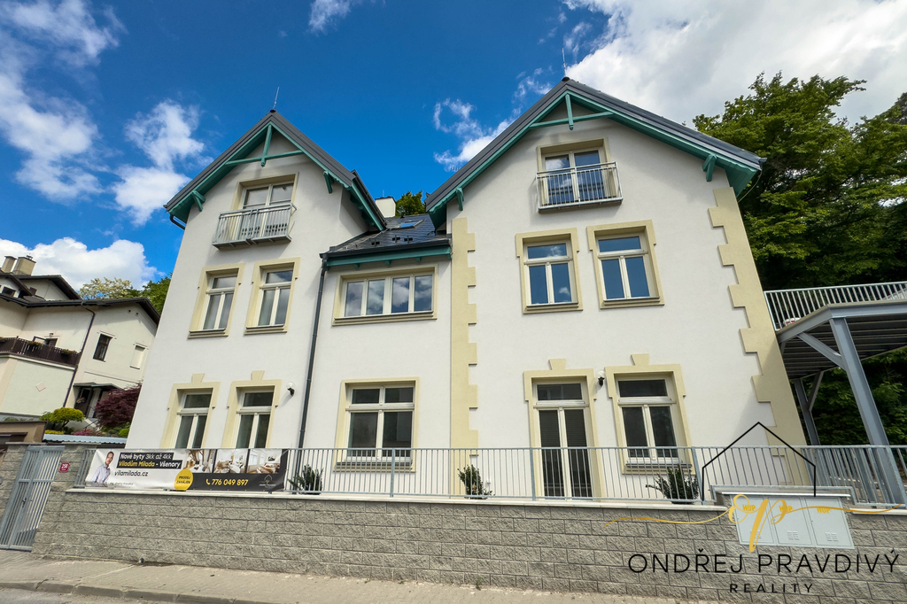 Byt se nachází v posledním 3. nadzemním podlaží a po kompletní přestavbě se může pyšnit nadstandardní kvalitou provedení a použitých materiálů. Provedení zahrnuje dřevěné plovoucí podlahy, dřevěná euro okna s trojskly, designové dlažby a nadčasové obklady. Značková sanita firem Laufen a Hansgrohe. Dále jsou datové rozvody, příprava na zabezpečení a elektromobilitu. Díky zateplení celého domu i vlastnímu kondenzačnímu kotli pro vytápění a ohřev vody budou provozní náklady skutečně příznivé. Převažující orientace na jiho-západ zajišťuje dostatek slunečního světla a stropy s přiznaným trámovím zase útulný pocit s puncem historie. Příslušenství bytu zahrnuje do zeleně orientovaný balkón, vlastní parkovací stání a prostorný sklep 11 m² na jakékoliv sportovní či sezónní vybavení. Další úložné prostory jsou v půdě nad bytem.