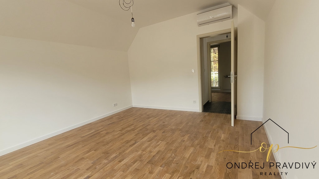 Byt se nachází v posledním 3. nadzemním podlaží a po kompletní přestavbě se může pyšnit nadstandardní kvalitou provedení a použitých materiálů. Provedení zahrnuje dřevěné plovoucí podlahy, dřevěná euro okna s trojskly, designové dlažby a nadčasové obklady. Značková sanita firem Laufen a Hansgrohe. Dále jsou datové rozvody, příprava na zabezpečení a elektromobilitu. Díky zateplení celého domu i vlastnímu kondenzačnímu kotli pro vytápění a ohřev vody budou provozní náklady skutečně příznivé. Převažující orientace na jiho-západ zajišťuje dostatek slunečního světla a stropy s přiznaným trámovím zase útulný pocit s puncem historie. Příslušenství bytu zahrnuje do zeleně orientovaný balkón, vlastní parkovací stání a prostorný sklep 11 m² na jakékoliv sportovní či sezónní vybavení. Další úložné prostory jsou v půdě nad bytem.