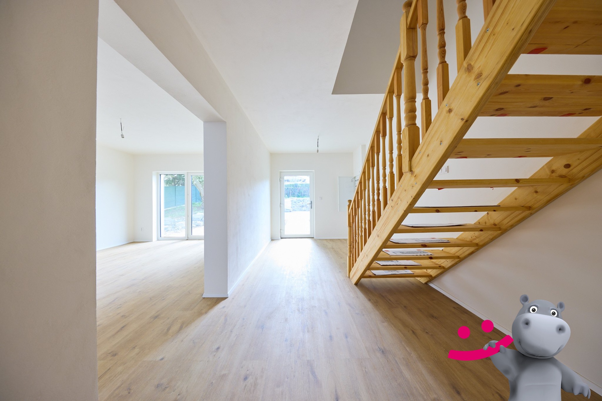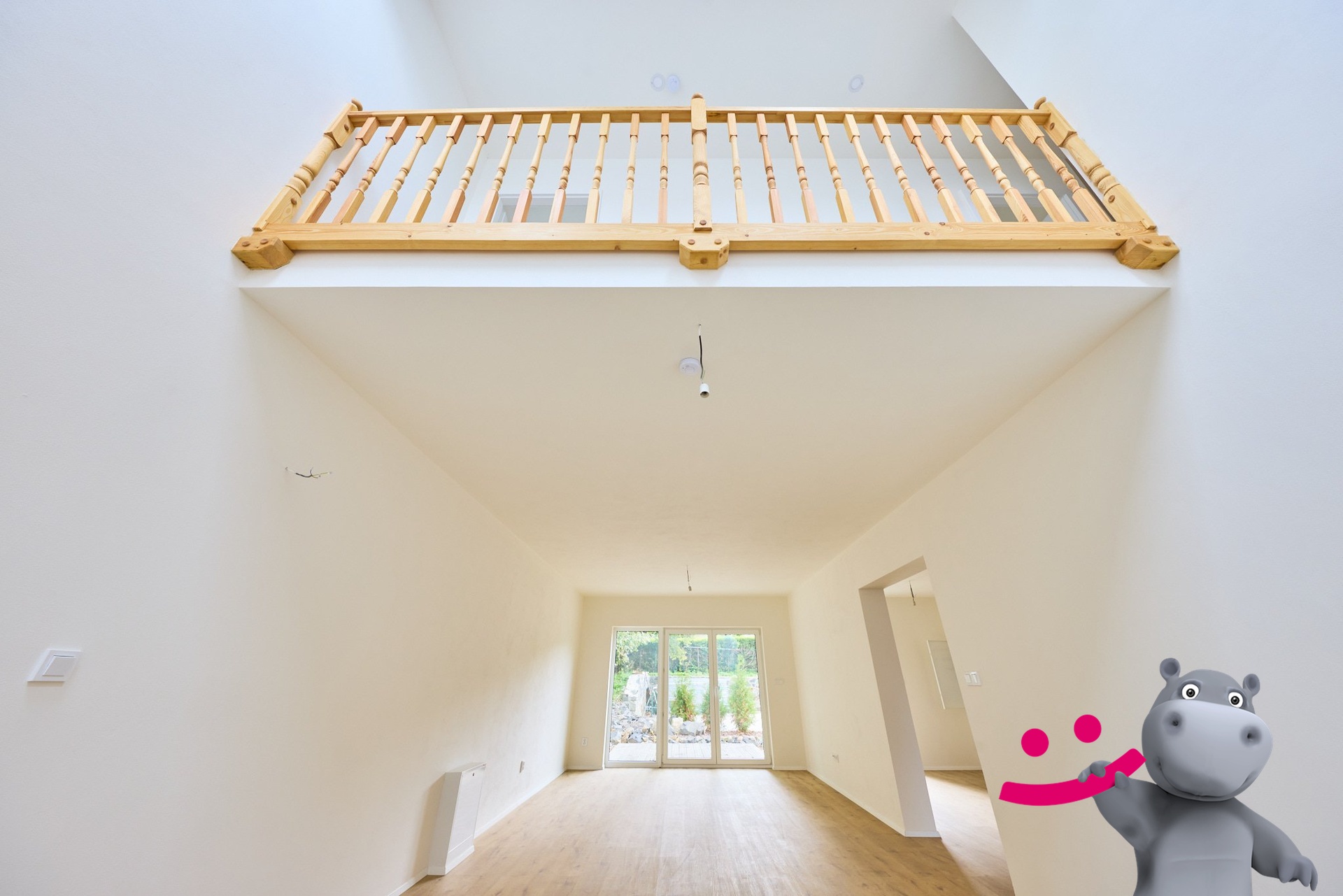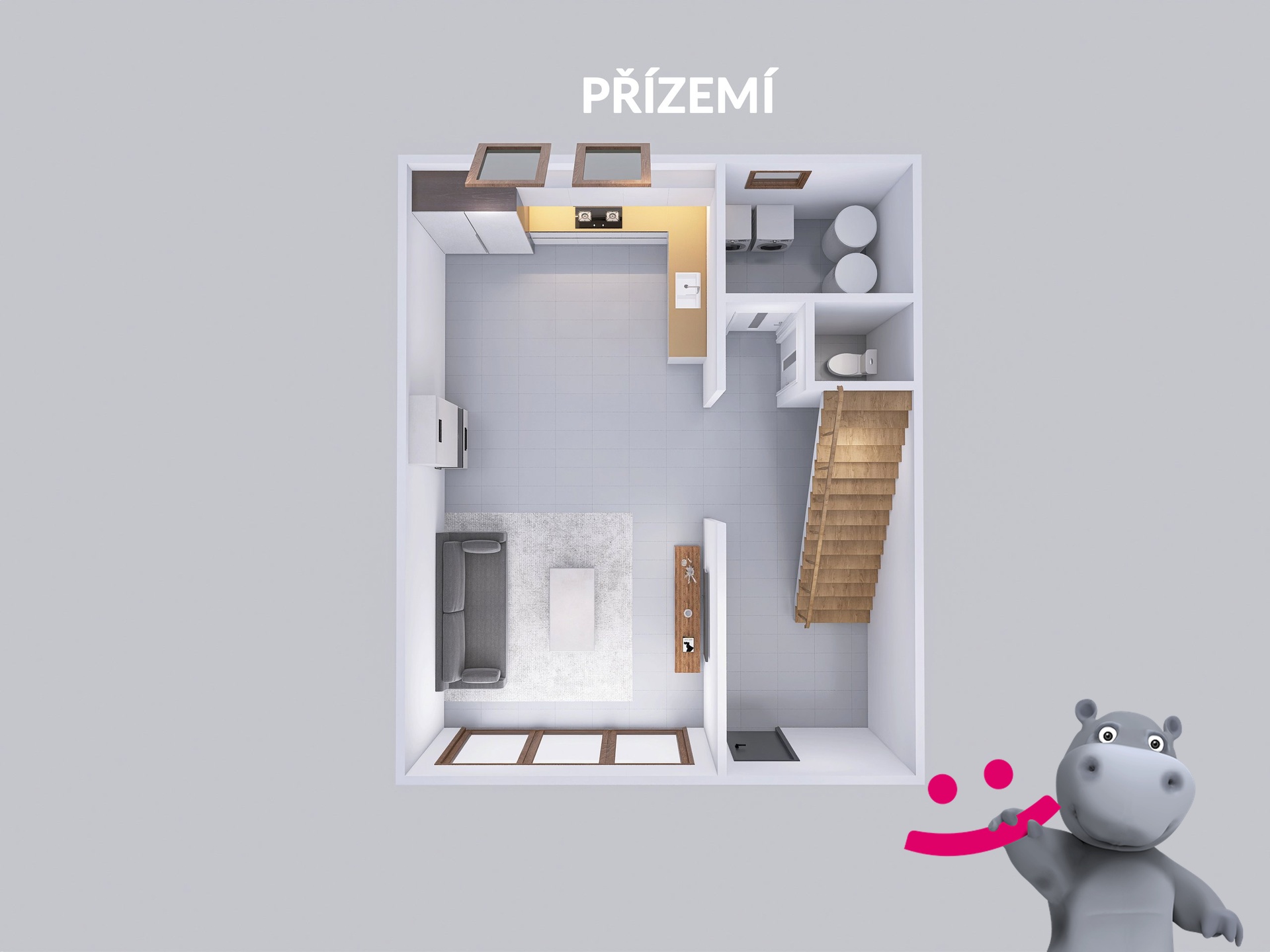 Přízemí – Vstupní hala, samostatná toaleta, technická místnost a obývací pokoj s kuchyňským koutem.