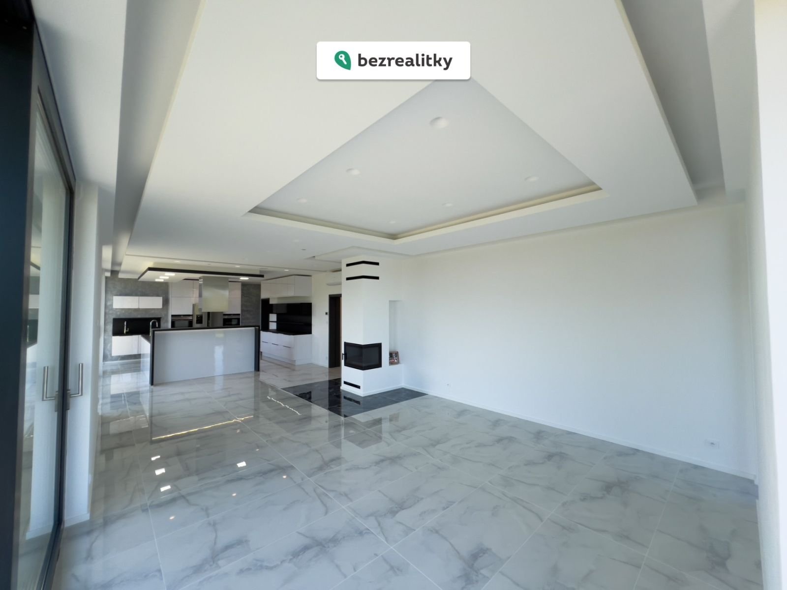 Interiér tvoří prostorný obývací pokoj s krbovou vložkou a třemi přímými vstupy na terasu, moderní kuchyň Siemens s ostrůvkem, velikou samostanou místností - spíží, kávovým barem a kompletními vestavěnými spotřebiči. Koupelna nabízí samostatně stojící vanu i velmi prostorný sprchový kout.