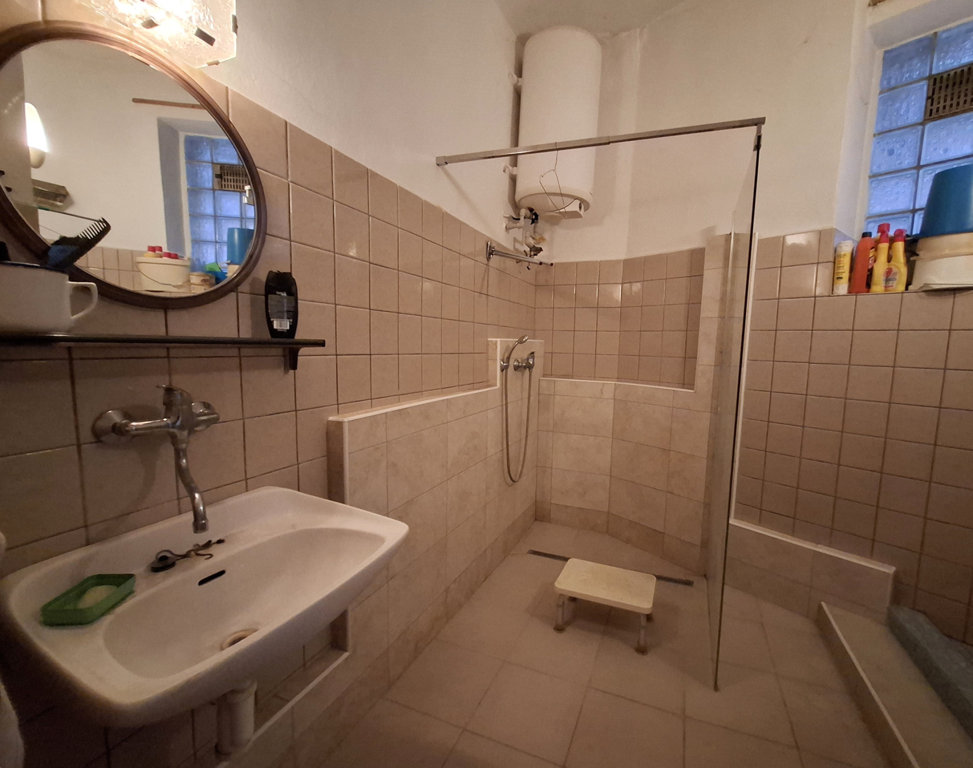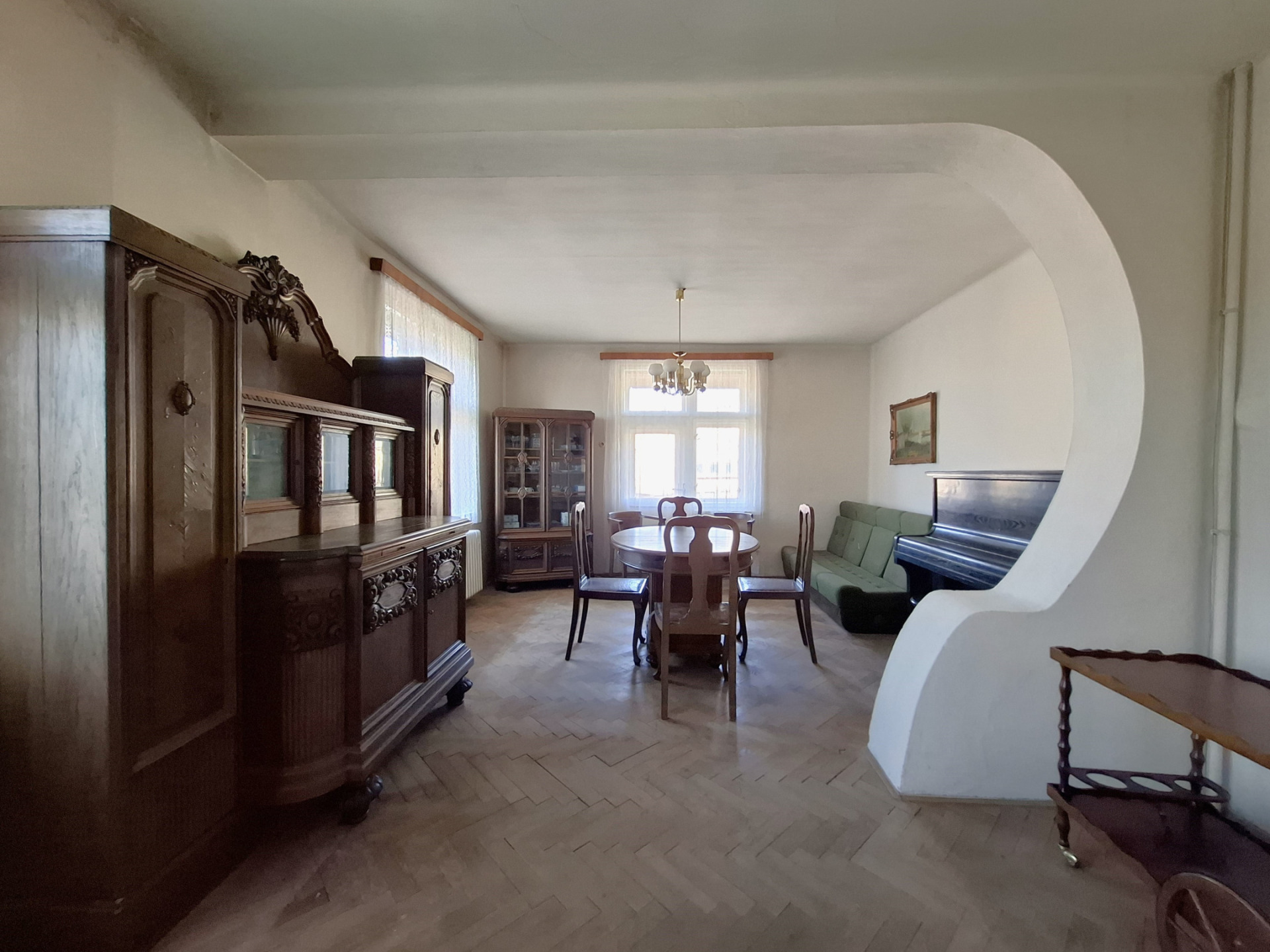 Dům má celkovou podlahovou plochu 215 m2 + půdní prostor cca 80 m2. Dále k dispozici prostorná kolna/dílna 74 m2 a velká stodola s garáží 103 m2. Celková plocha pozemku je 1457 m2 (tj. zastavěná plocha a nádvoří 917 m2 + zahrada 540 m2). Dům je ve stavu před rekonstrukcí: svislé nosné konstrukce: kámen, cihly, tvárnice vč. kombinací; stropy: klenba v 1. patře a trámové stropy v 2.patře. Dům je napojen na všechny inženýrské sítě: obecní vodovod, kanalizace, elektřina a plynovod. Vytápění domu aktuálně plynovým kotlem s rozvodem do radiátorů. V 1. NP domu se nachází byt 3+1, podlahová plocha 74 m2, v 2.NP domu byt 3+1, podl. plocha 83 m2 + balkón 5,12 m2, v podkroví prostorná půda vhodná k další vestavbě. Byty mají samostatné vchody ze společné chodby domu. Vjezd na pozemek z obecní komunikace.