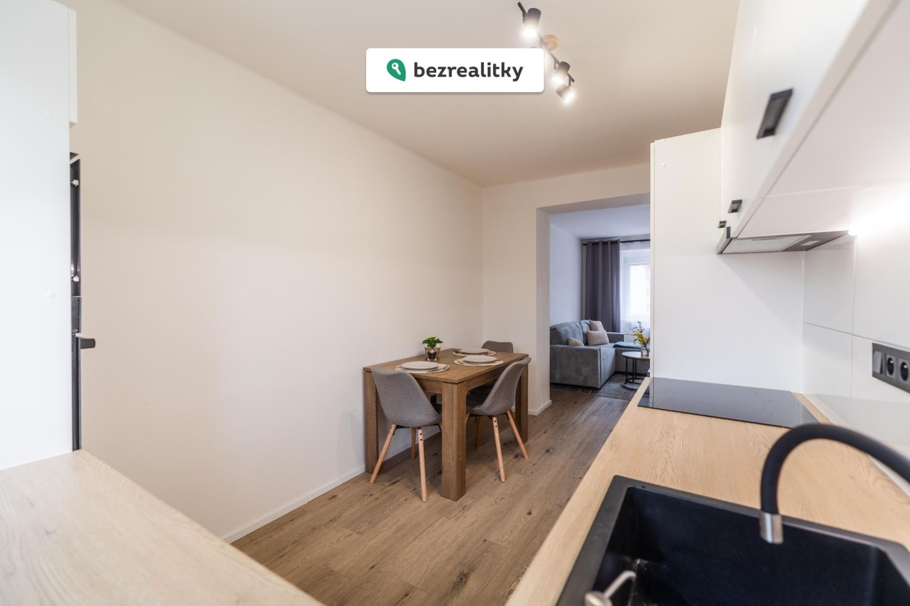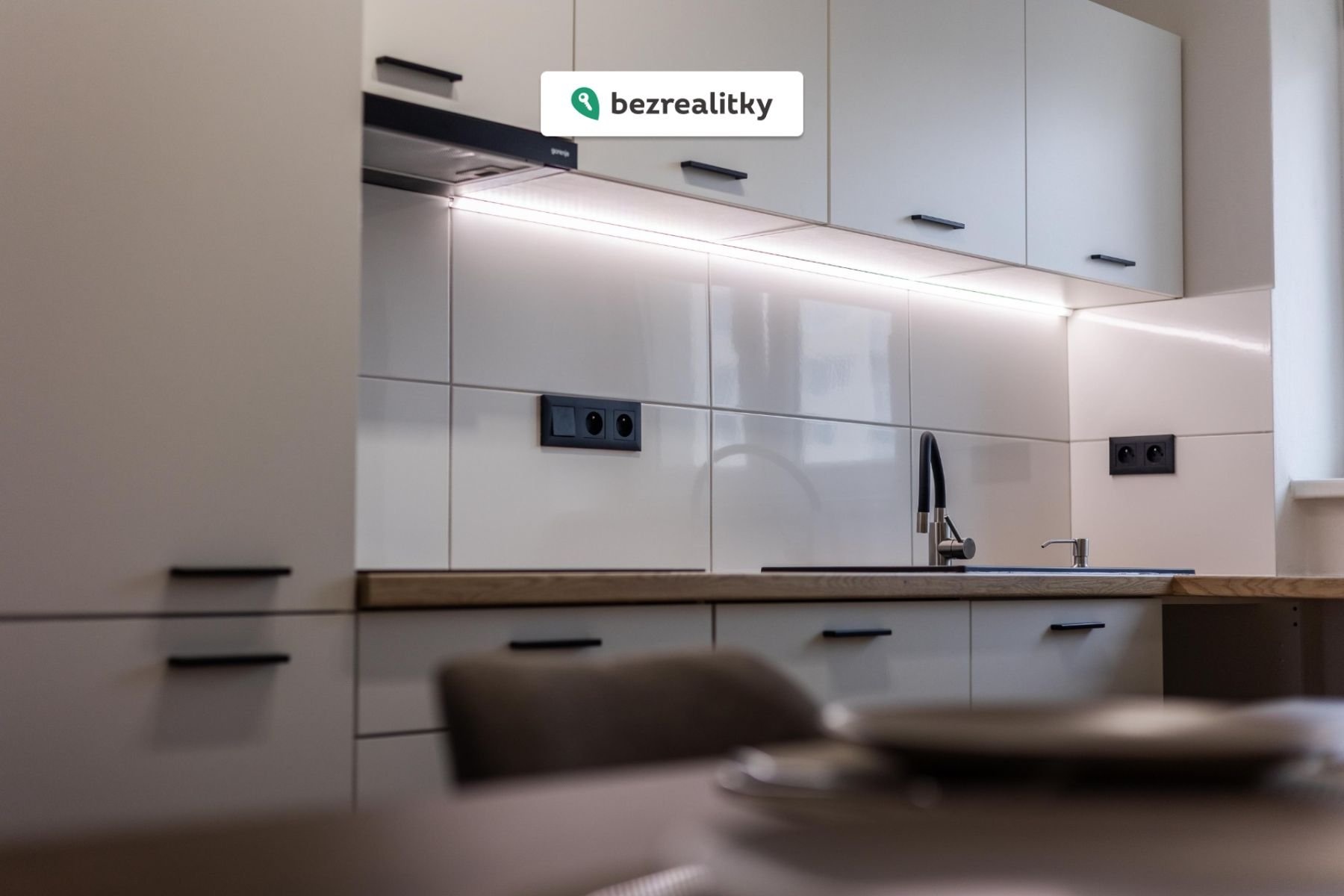 - Designovou kuchyňskou linku včetně vestavěných spotřebičů (myčka, trouba, mikrovlnka, indukční deska, lednice s mrazákem)
