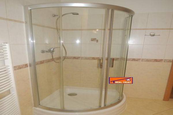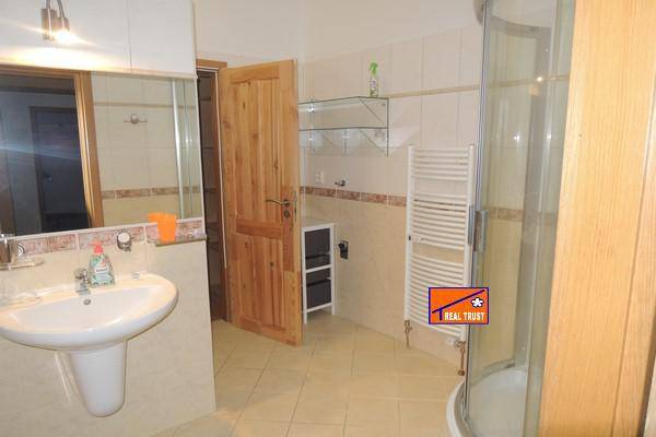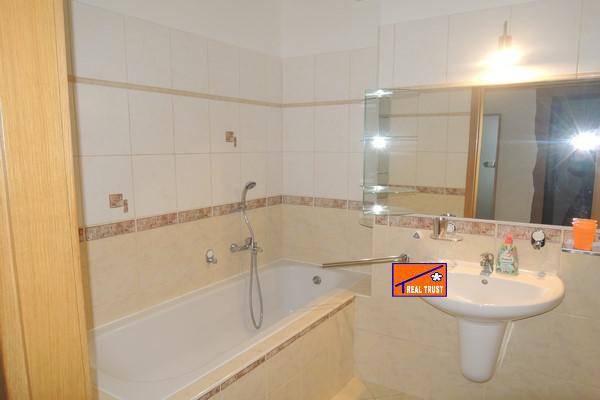 V prostorné koupelně ,do které je přístup jak z předsíně, tak z ložnice, je umístěna vana i sprchový kout, je zde dostatek místa na pračku a sušičku prádla. WC je stavebně odděleno a začleněno do koupelny tak, aby se koupelna mohla používat nezávisle. K bytu náleží sklep, který je v přízemí domu a společné prostory.