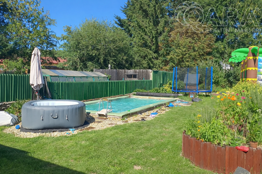 Vodní prvky: Dominantou je plně funkční bazén (3x6 m) s filtrací a zakrytím, vedle kterého najdete nafukovací vířivku a okrasné jezírko (1000 l).