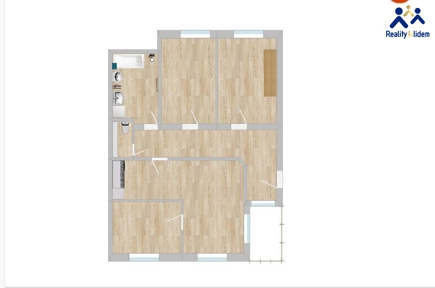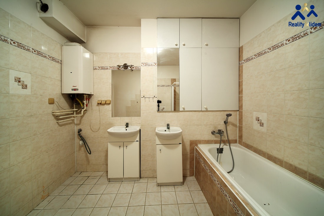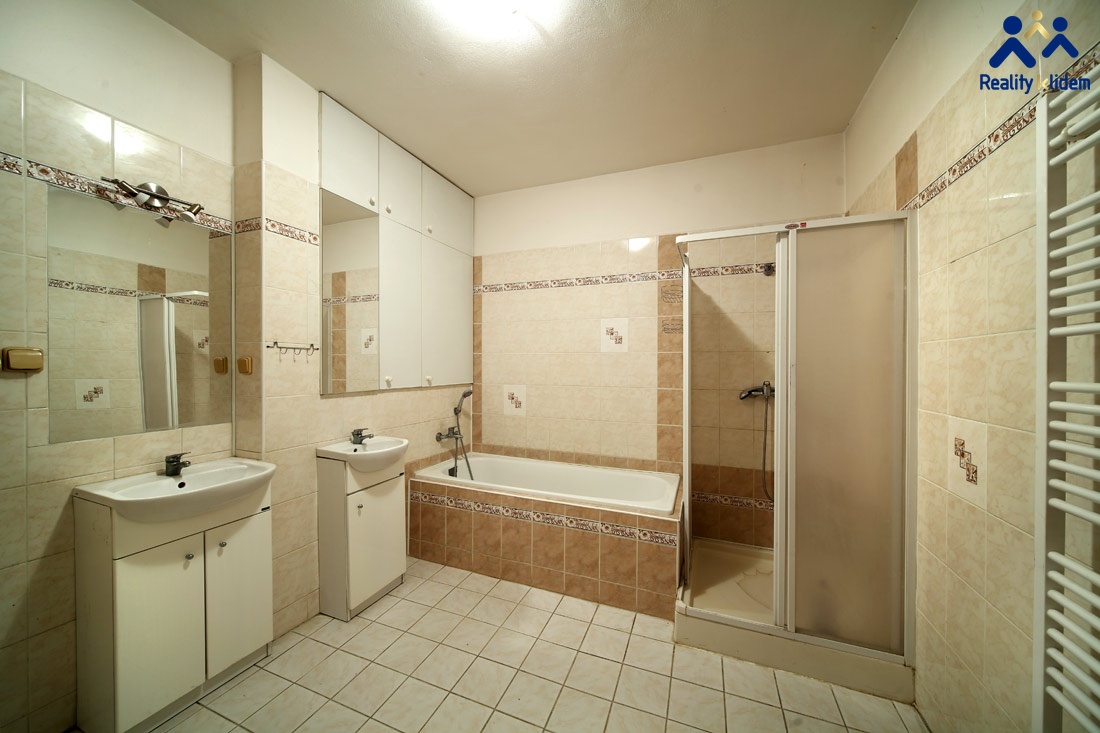 Z chodby 13,75m² vstup na WC 1,8m² a nadstandartní, velkou koupelnu 7,5m² s vanou, sprchovým koutem dvěma umyvadly, místem pro pračku. Dva samostatné pokoje každý11,4m² ( viz. fota ). Velká kuchyně + obývací pokoj s malým balkónem 36 m² včetně ložnice.