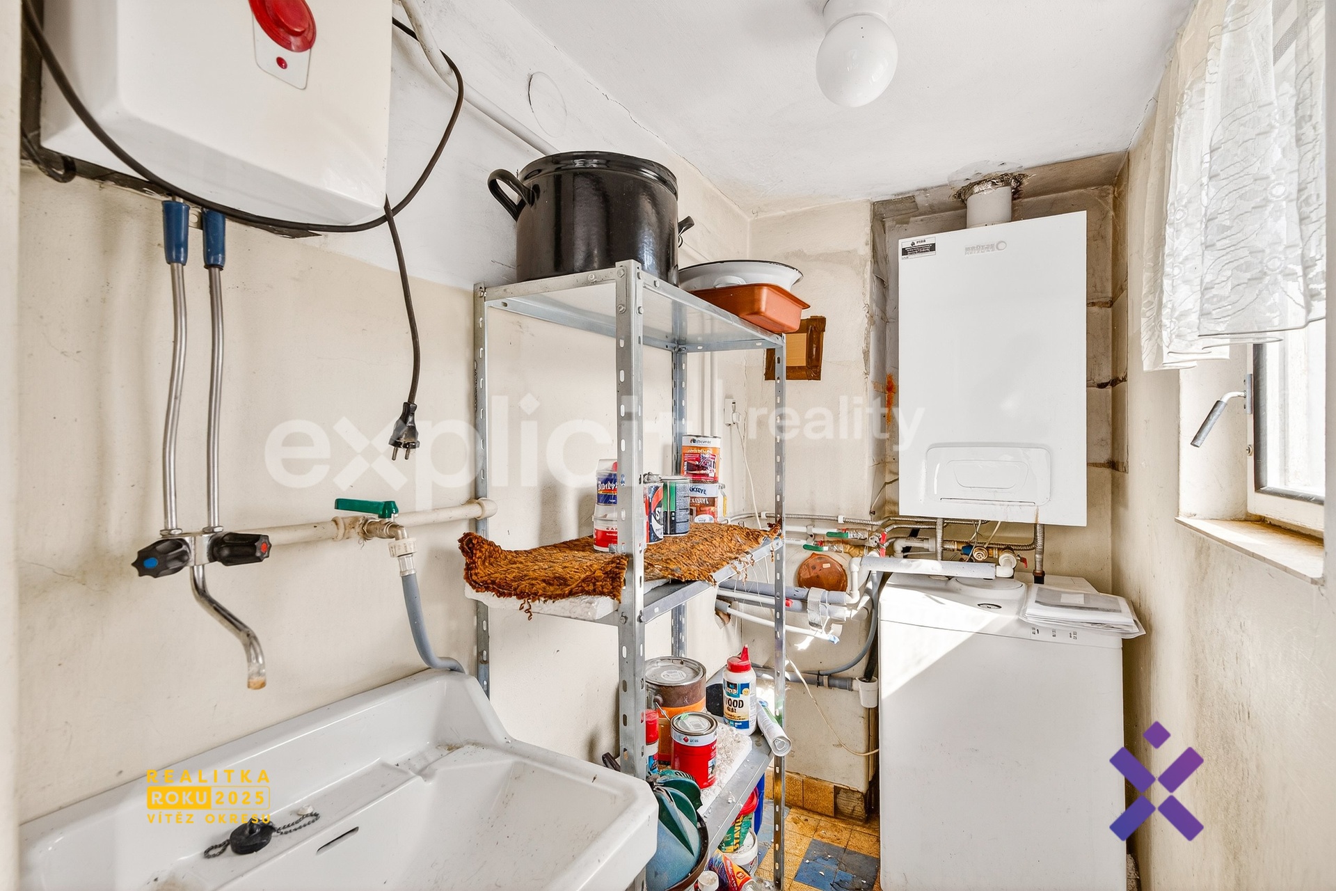 Naproti ní je část domu samostatně uspořádaná a slouží jako sanitární a skladovací zóna, je zde samostatná toaleta, koupelna vybavená vanou a bojlerem a vedle ní menší místnost vhodná například jako špajz nebo sklad.
