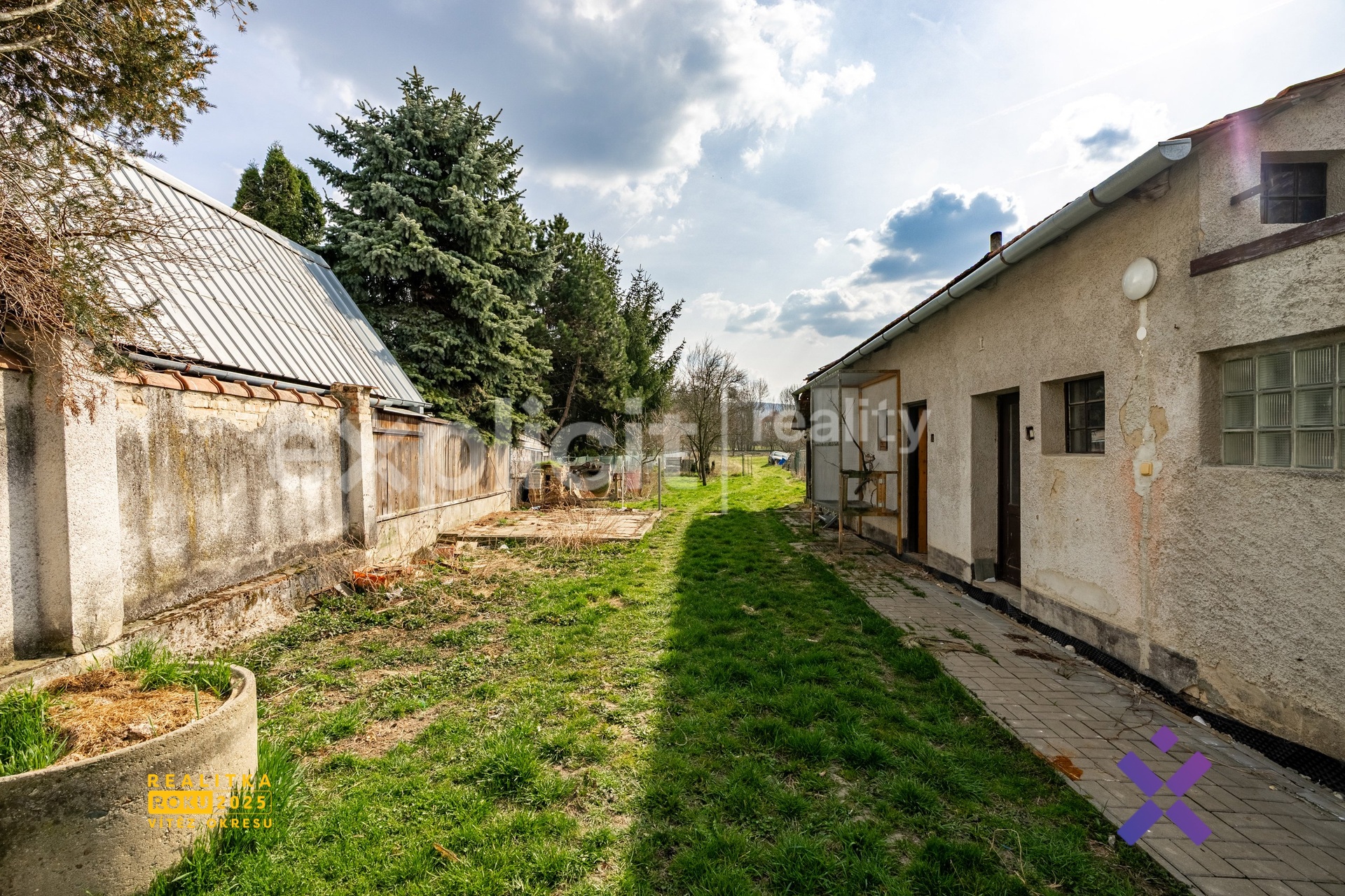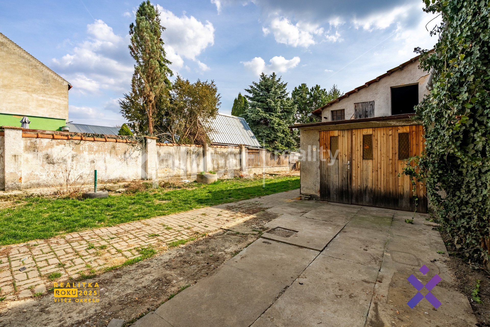 Vstup do domu je přes průjezdová vrata, která vedou do prostorné chodby umožňující vstup do domu i na dvorek, za nímž se rozkládá zahrada o celkové ploše 1 196 m². Z této chodby je také přístup do technické místnosti.