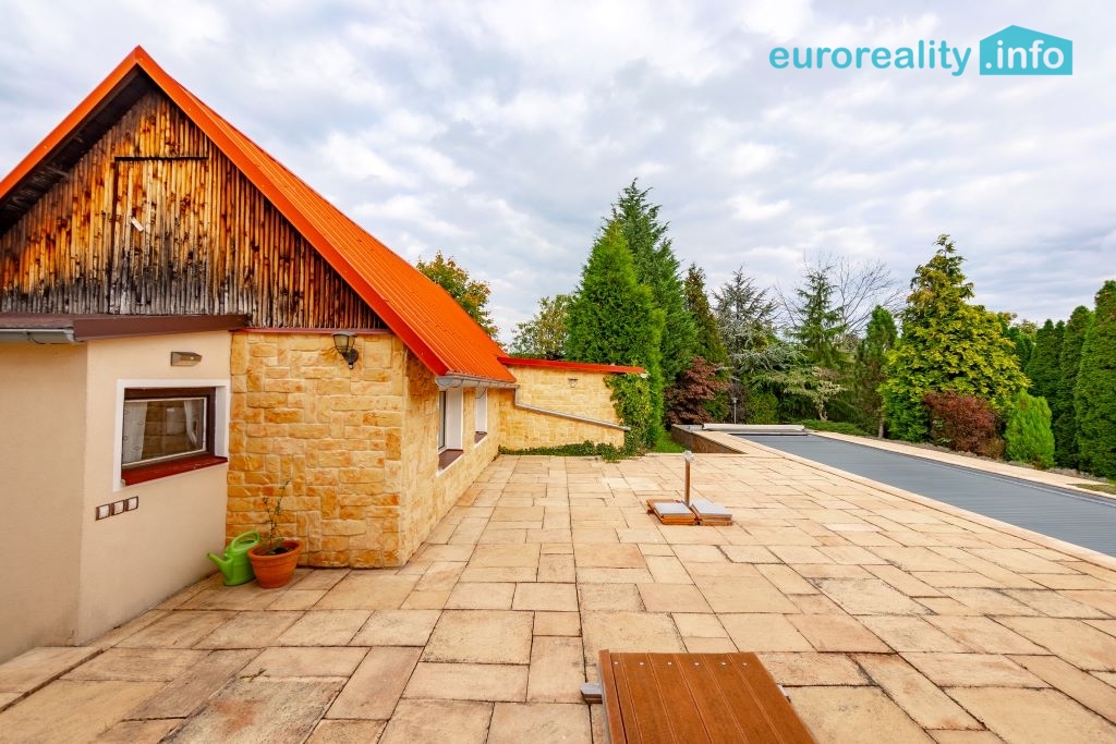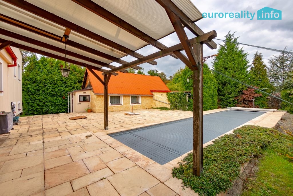 Celková výměra pozemku činí 2 259 m². Součástí je udržovaná oplocená zahrada, venkovní bazén o rozměrech 2,7 × 14 m s vyhříváním, solární lamelou, protiproudem a filtrací, dále venkovní gril a dostatek prostoru pro parkování.