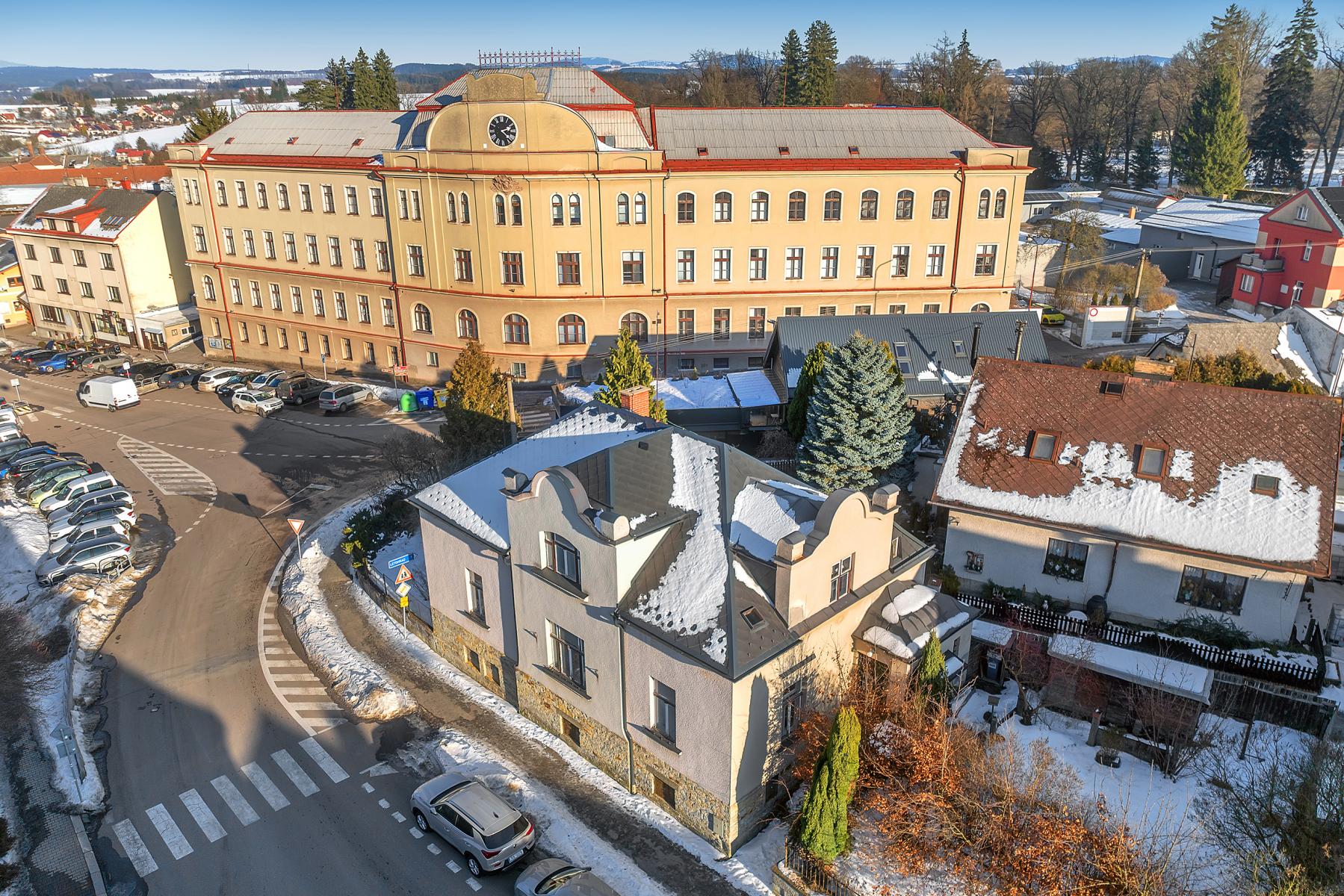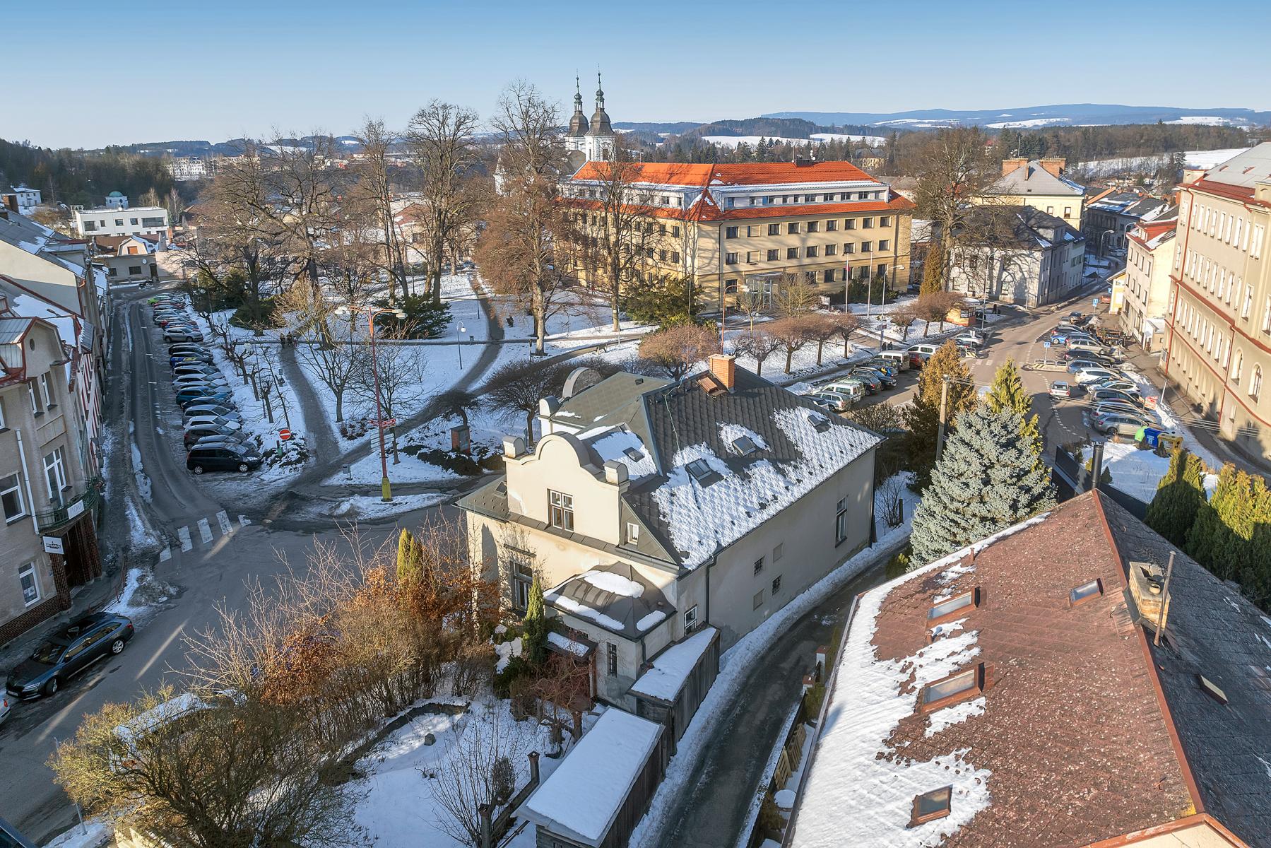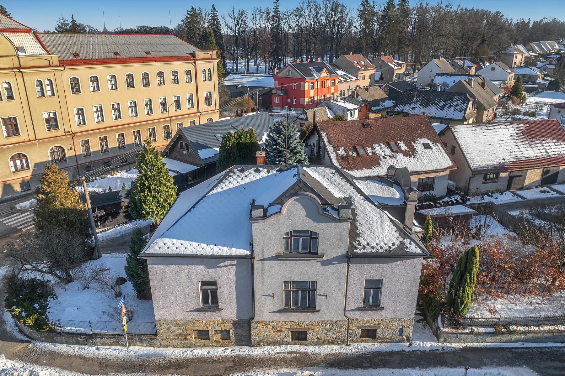 K prodeji prvorepubliková vila z roku 1912 v obci Žamberk, stojící poblíž náměstí, na nároží ulic Nádražní a 28. října. Po rekonstrukci vila nabídne ideální místo pro bydlení i podnikání. Hlavní vstup je orientován do ulice Nádražní, přístup je řešen také z ulice U Divadla. Stavba nabízí zajímavé dispoziční uspořádání, jedno nadzemní podlaží a částečně využité podkroví. Dům je celopodsklepený, disponuje zastavěnou plochou 175 m2 a velkorysou užitnou plochou 320 m2. Vilu obklopuje zahrada o výměře 380 m2. Interiéru dominuje vzdušná vstupní hala s širokým schodištěm. V přízemí najdeme 4 prostorné pokoje a příslušenství v podobě komory a toalety. Rovněž z přízemí je vstup do jedné zahrady. V podkroví se nachází 2 pokoje, kuchyňský kout, koupelna s toaletou a další půdní prostory vhodné k vestavbě. Dům je napojen na veřejný vodovod, kanalizaci a elektřinu. Centrální vytápění domu zajišťoval kotel na tuhá paliva a krbová kamna. Parkování je k dispozici na obecních plochách u domu. Poblíž je pošta, městský úřad, školy, autobusové nádraží, obchody a veškeré služby. Doporučuji prohlídku vzhledem k lokalitě a ojedinělé nabídce podobného charakteru.
