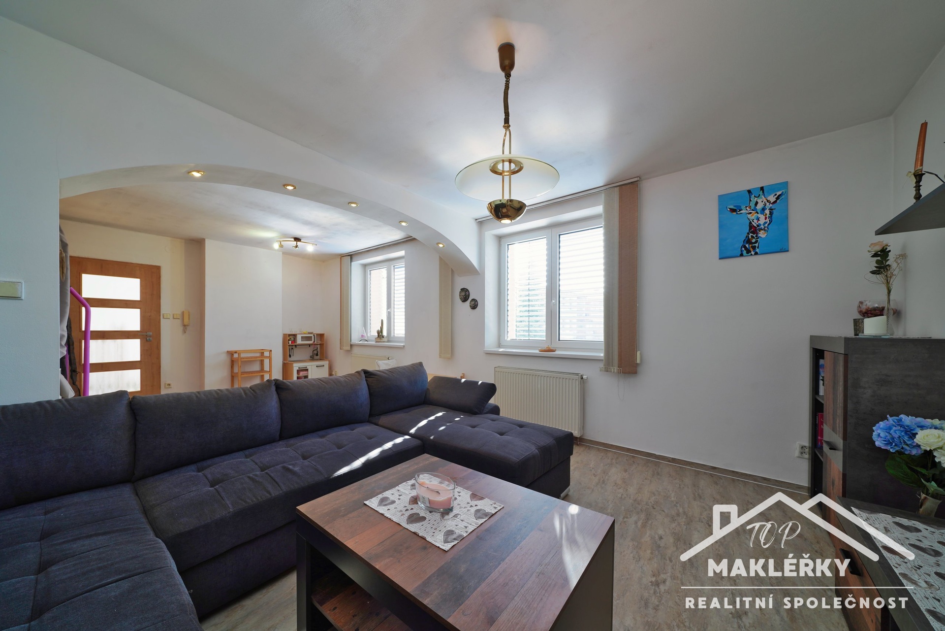 chodba se schody s dřevěným zábradlím do patra protínají celý dům a vedou opět ven, pod krytý prostor pergoly. Vpravo je umístěná ložnice, následně obývací pokoj menších rozměrů, propojený s kuchyní (spíž). Mezi sebou mají obloukový vchod bez dveří. V celé místnosti jsou různá poziční světla. Odsud vedou dveře do koupelny s WC, sprchovým koutem, vanou a umyvadlem). V jídelně, kuchyni a spodní koupelně - je částečně podlahové topení - hřeje, ale nelze jej ovládat - je zalité v betonu pod vinylem.