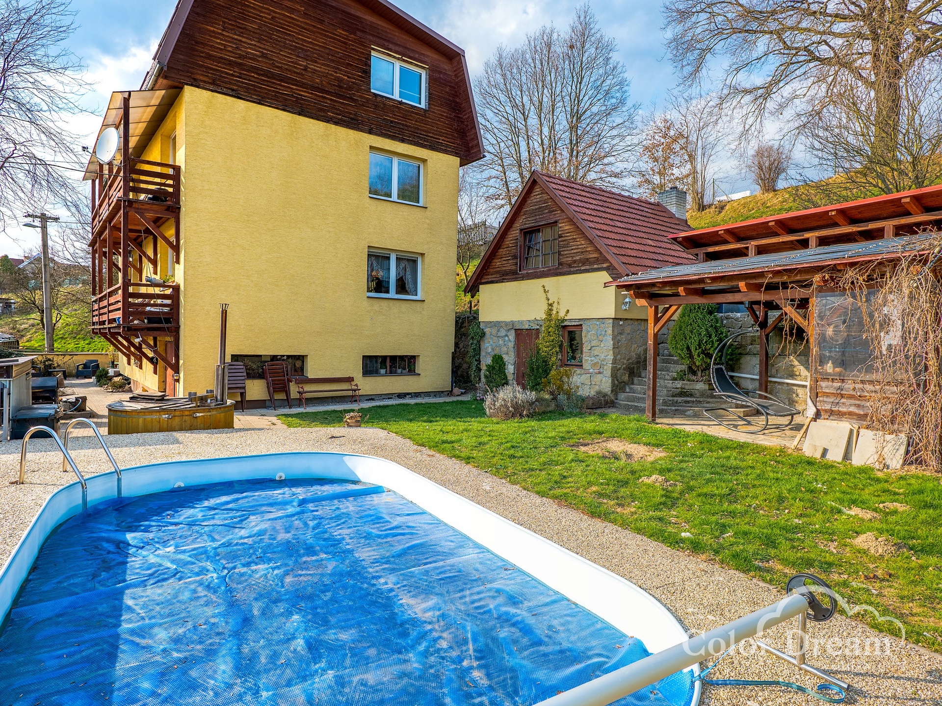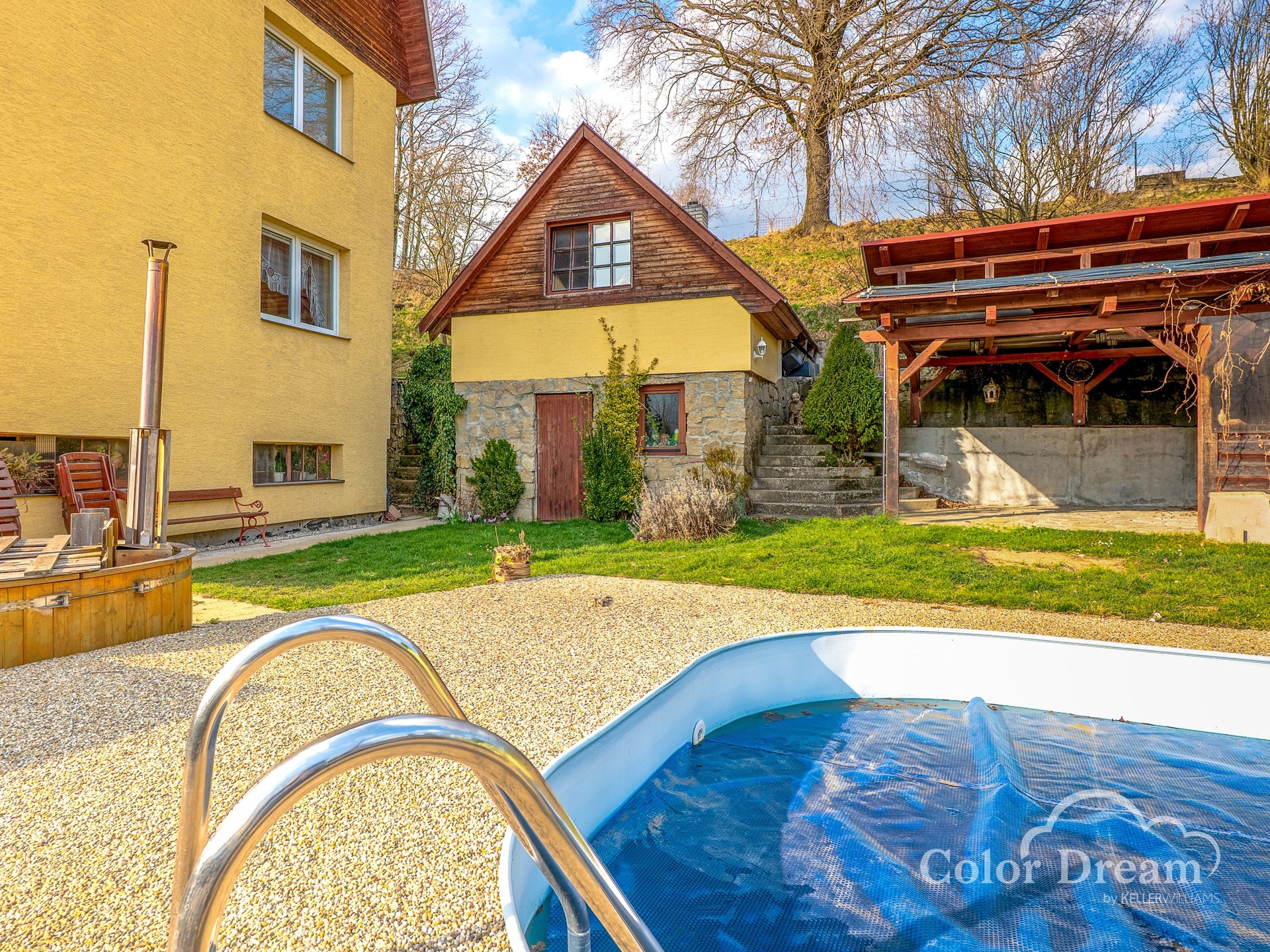 K domu náleží prostorný dvůr, který poskytuje ideální zázemí pro odpočinek i setkávání s rodinou či přáteli. Najdete zde pergolu s možností grilování, bazén pro letní osvěžení a také vedlejší budovu, kterou lze využít jako společenský prostor, zázemí pro hosty nebo například menší wellness či hobby místnost.