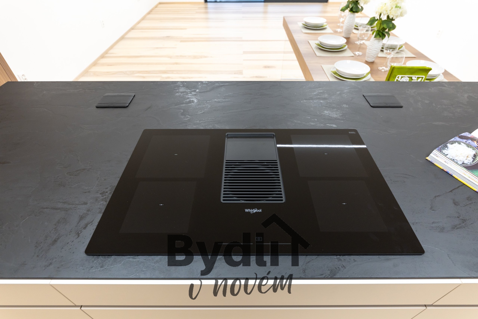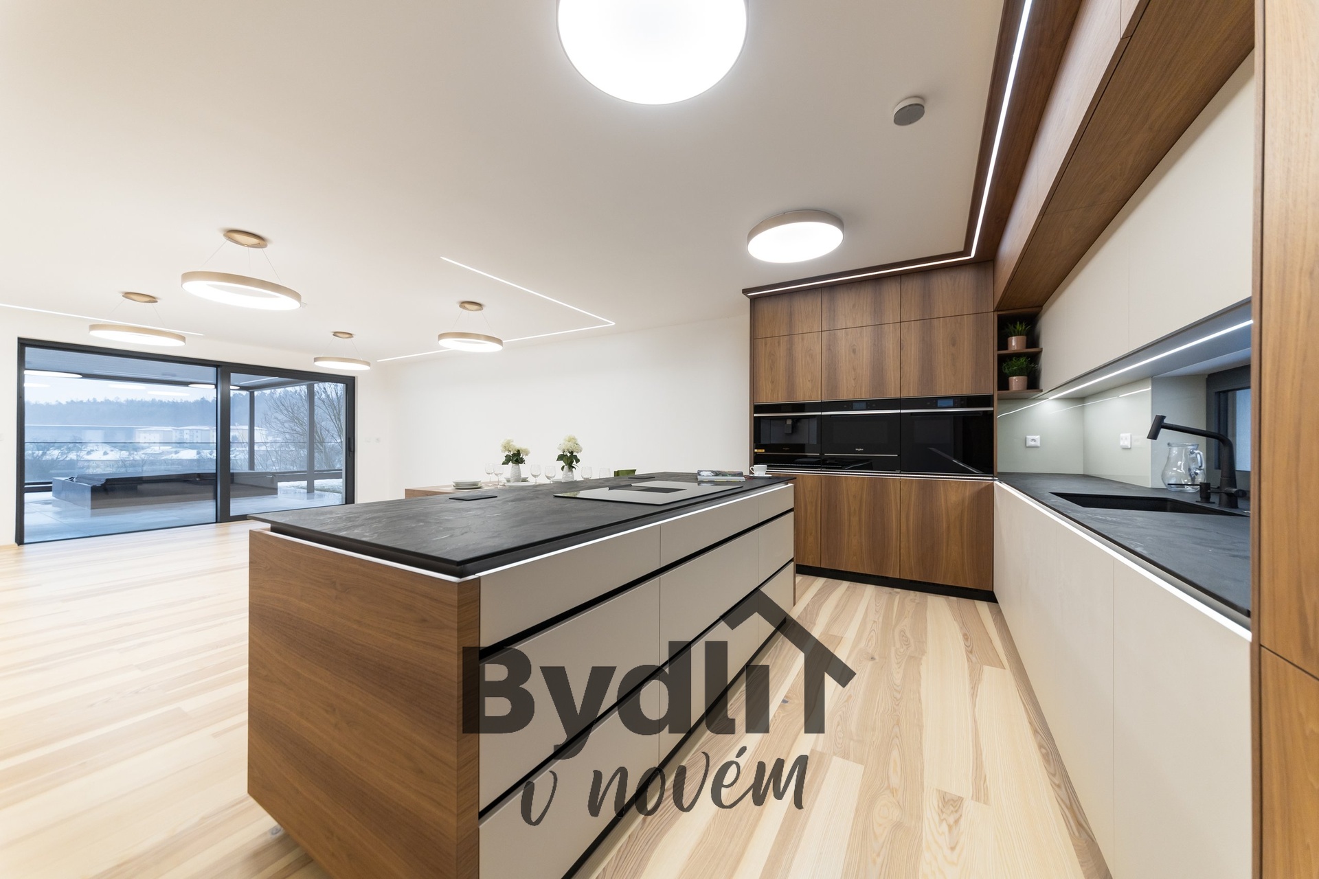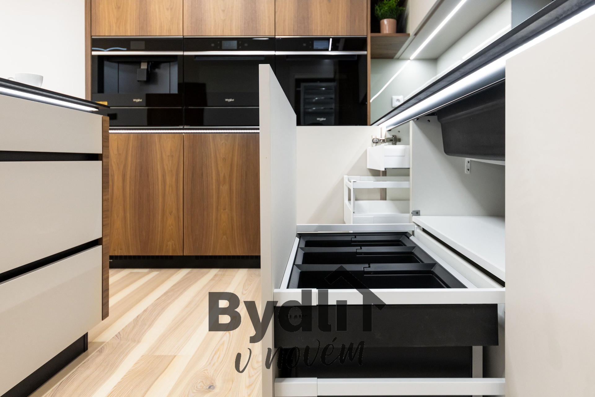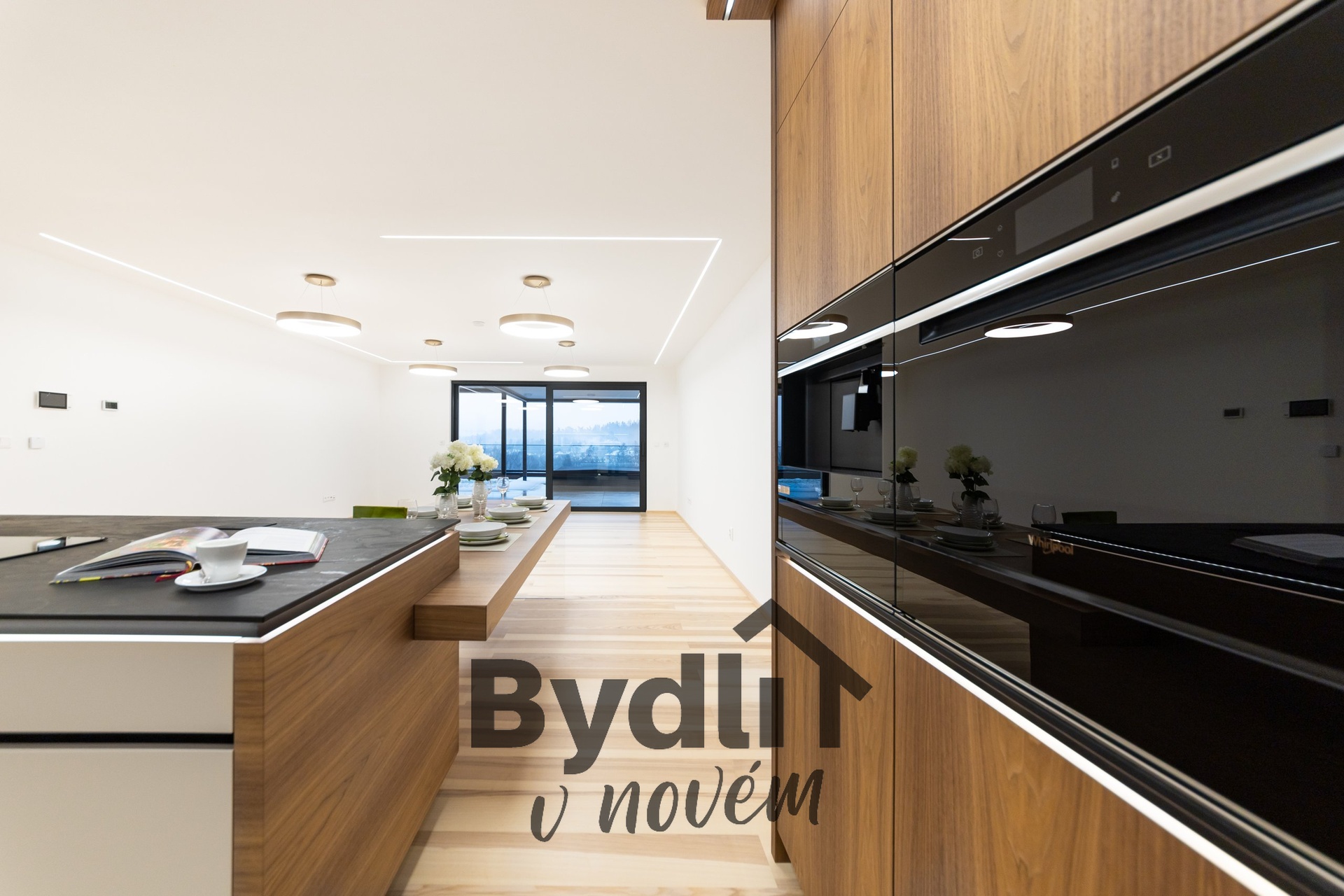 Kuchyňská linka s vestavěnými spotřebiči nejvyšší řady Whirlpool, včetně integrovaného kávovaru, výhřevných zásuvek a lednice o šířce 70cm. Součástí je praktický kuchyňský ostrůvek i designový jídelní stůl pro maximální komfort stolování a vaření.
