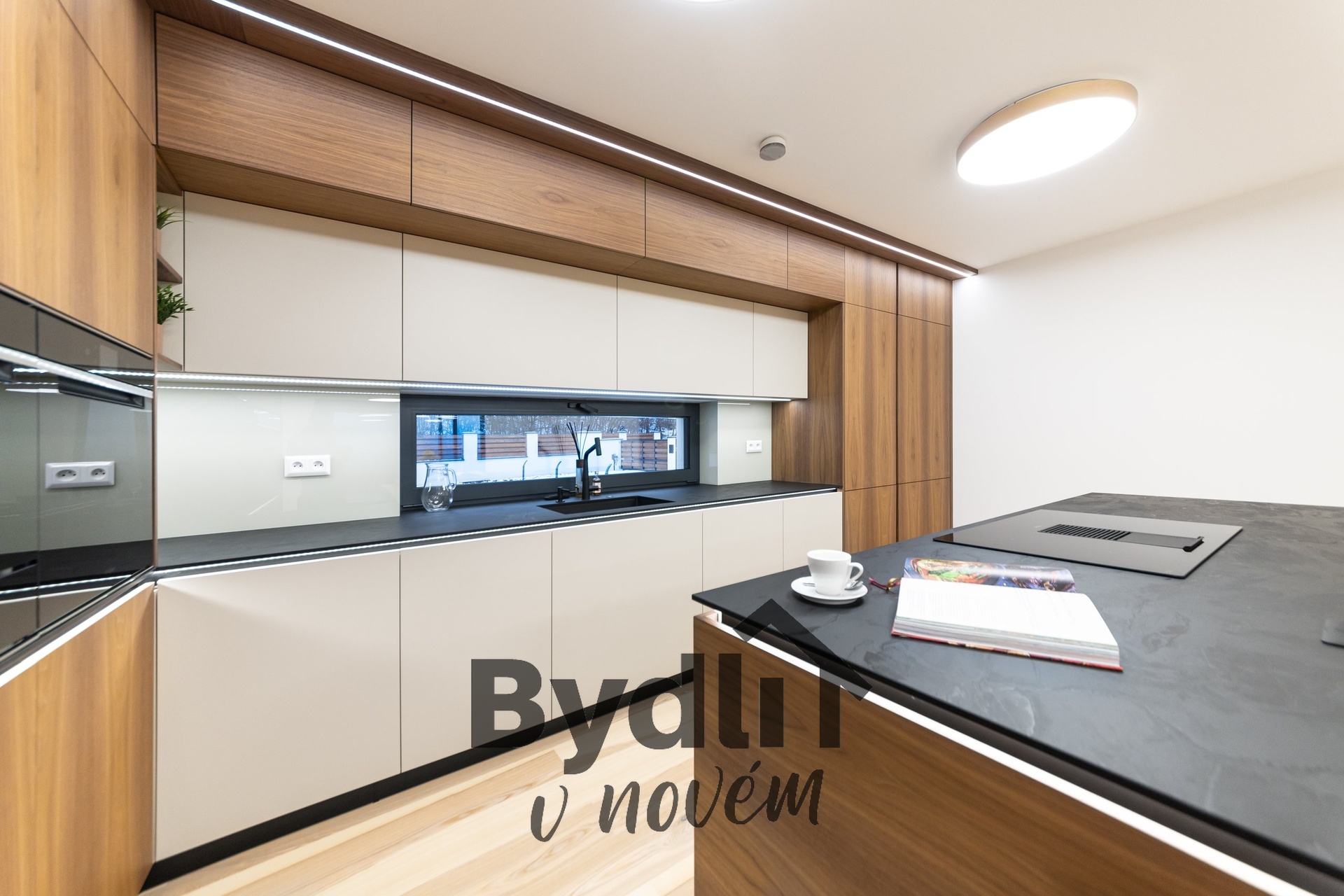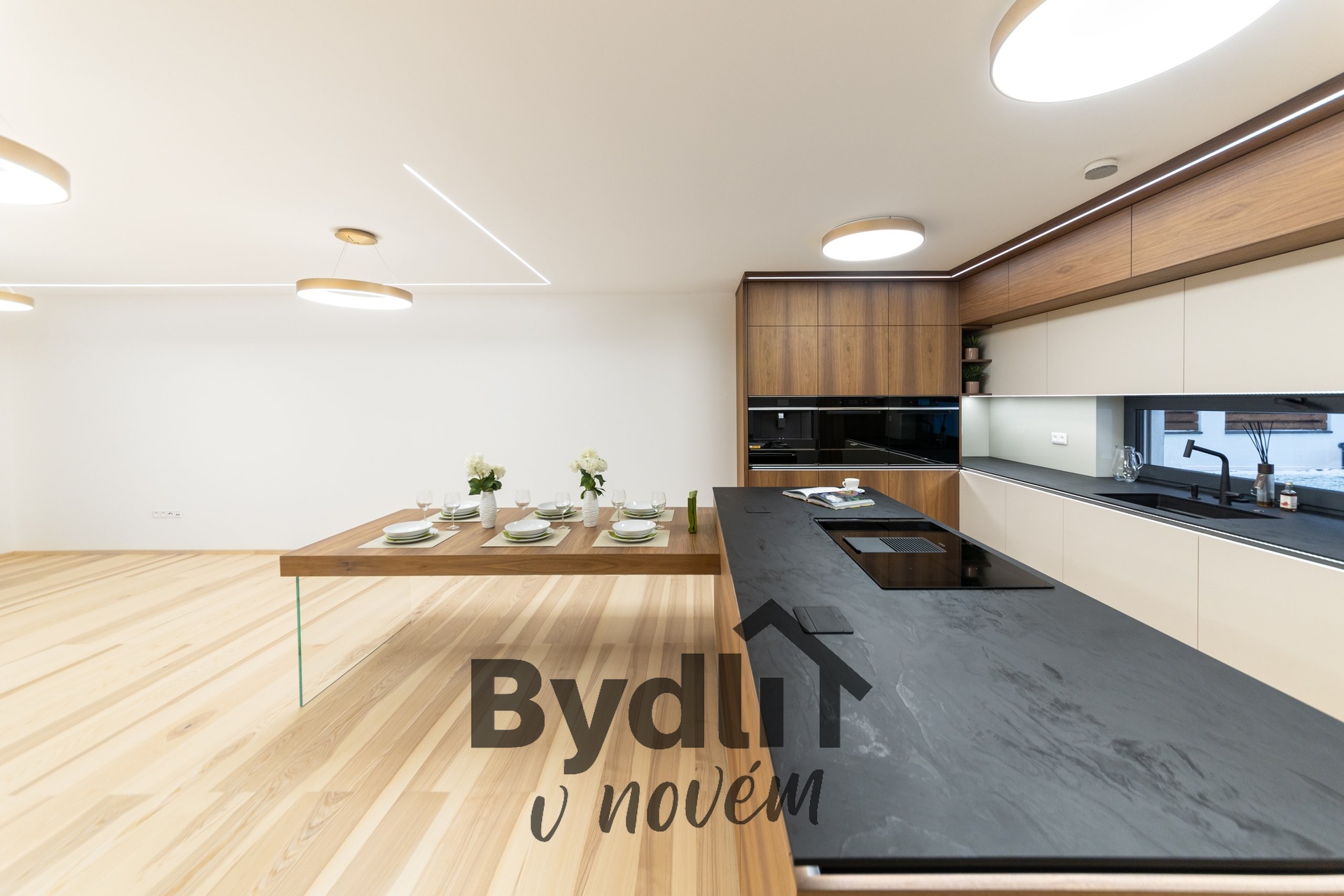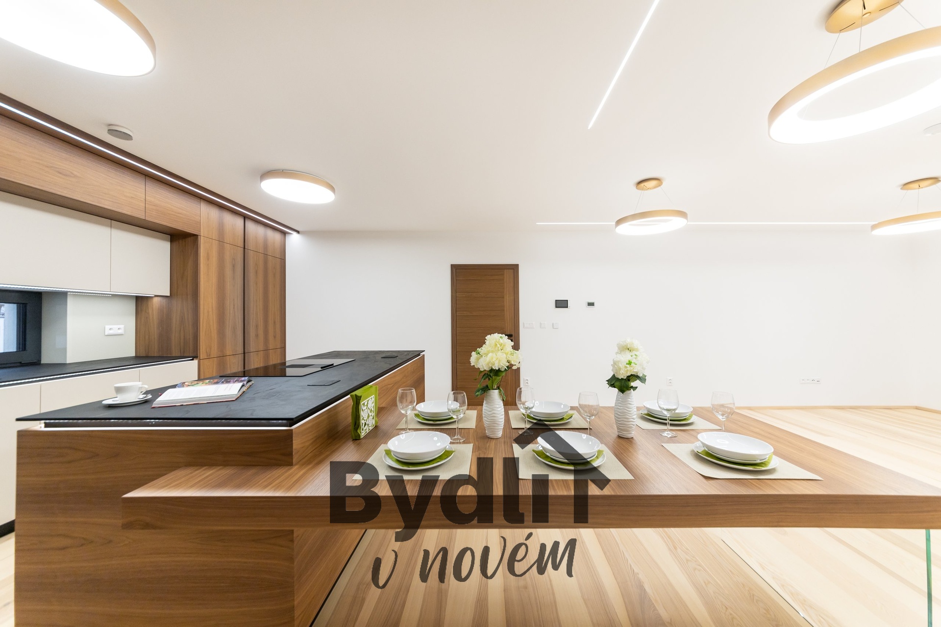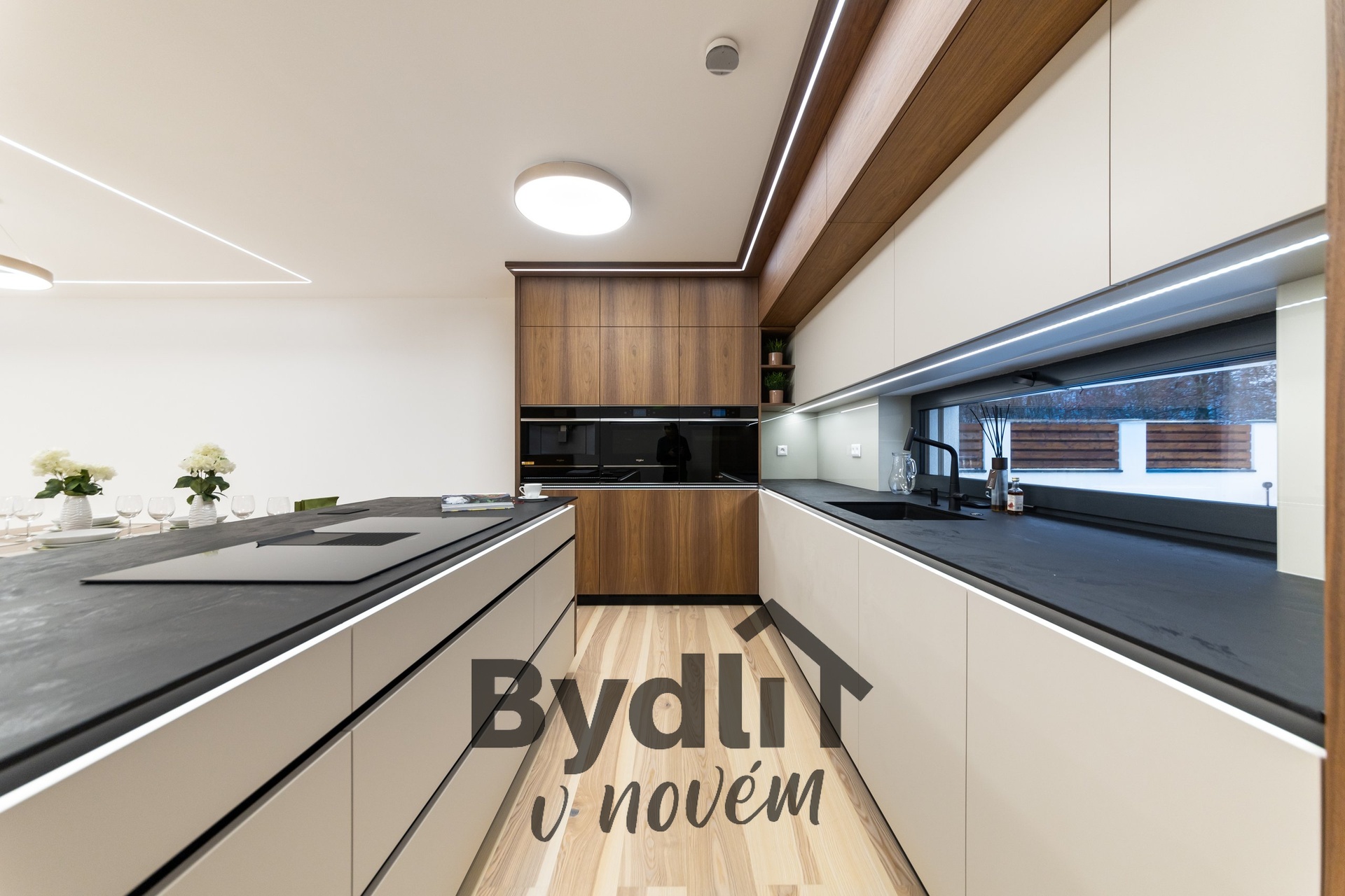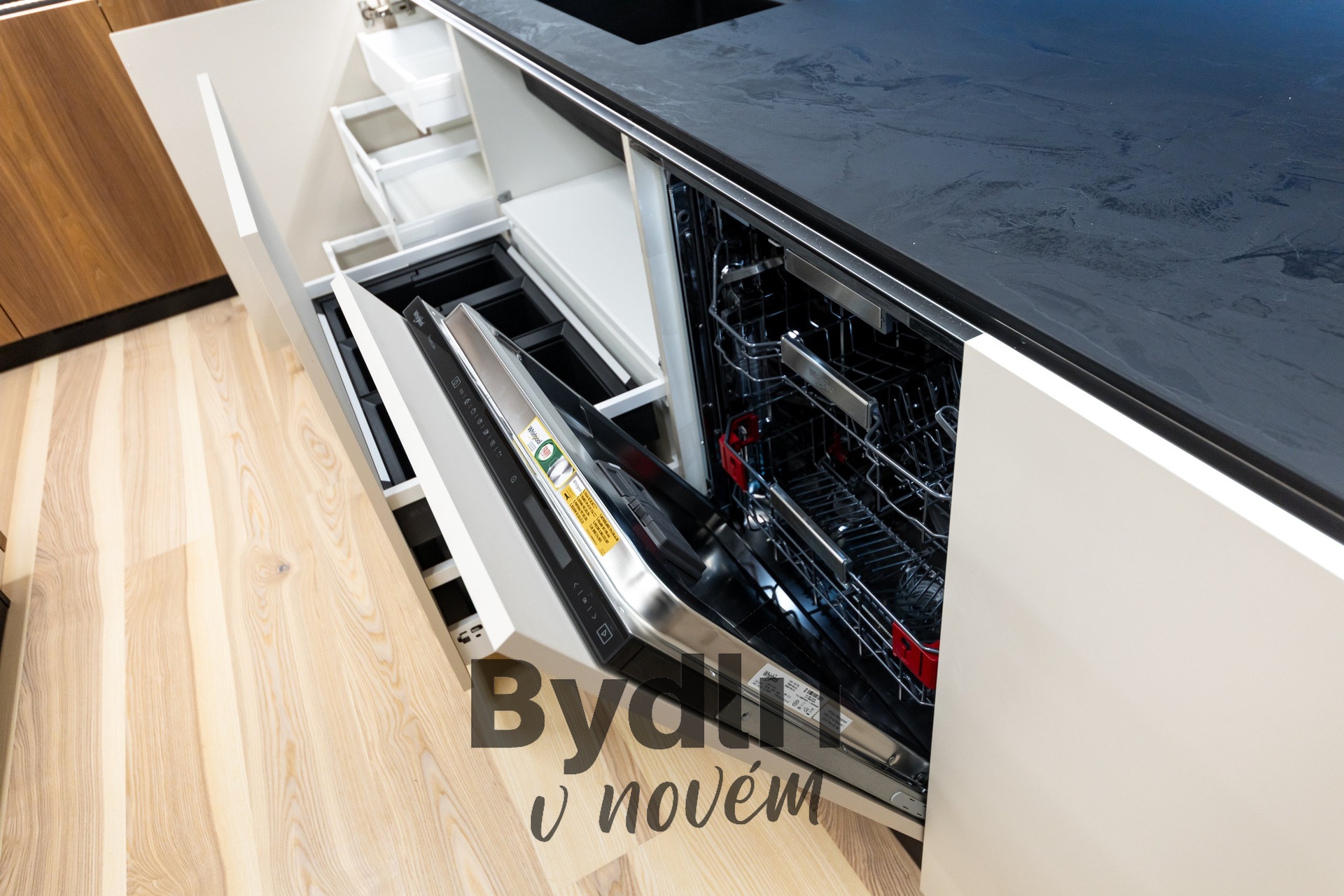 Kuchyňská linka s vestavěnými spotřebiči nejvyšší řady Whirlpool, včetně integrovaného kávovaru, výhřevných zásuvek a lednice o šířce 70cm. Součástí je praktický kuchyňský ostrůvek i designový jídelní stůl pro maximální komfort stolování a vaření.