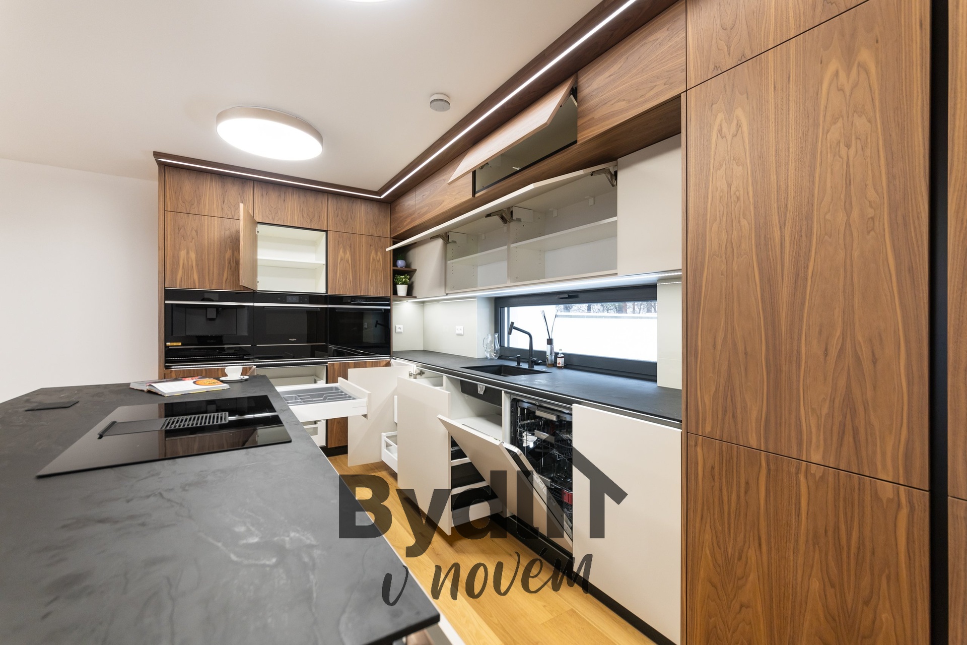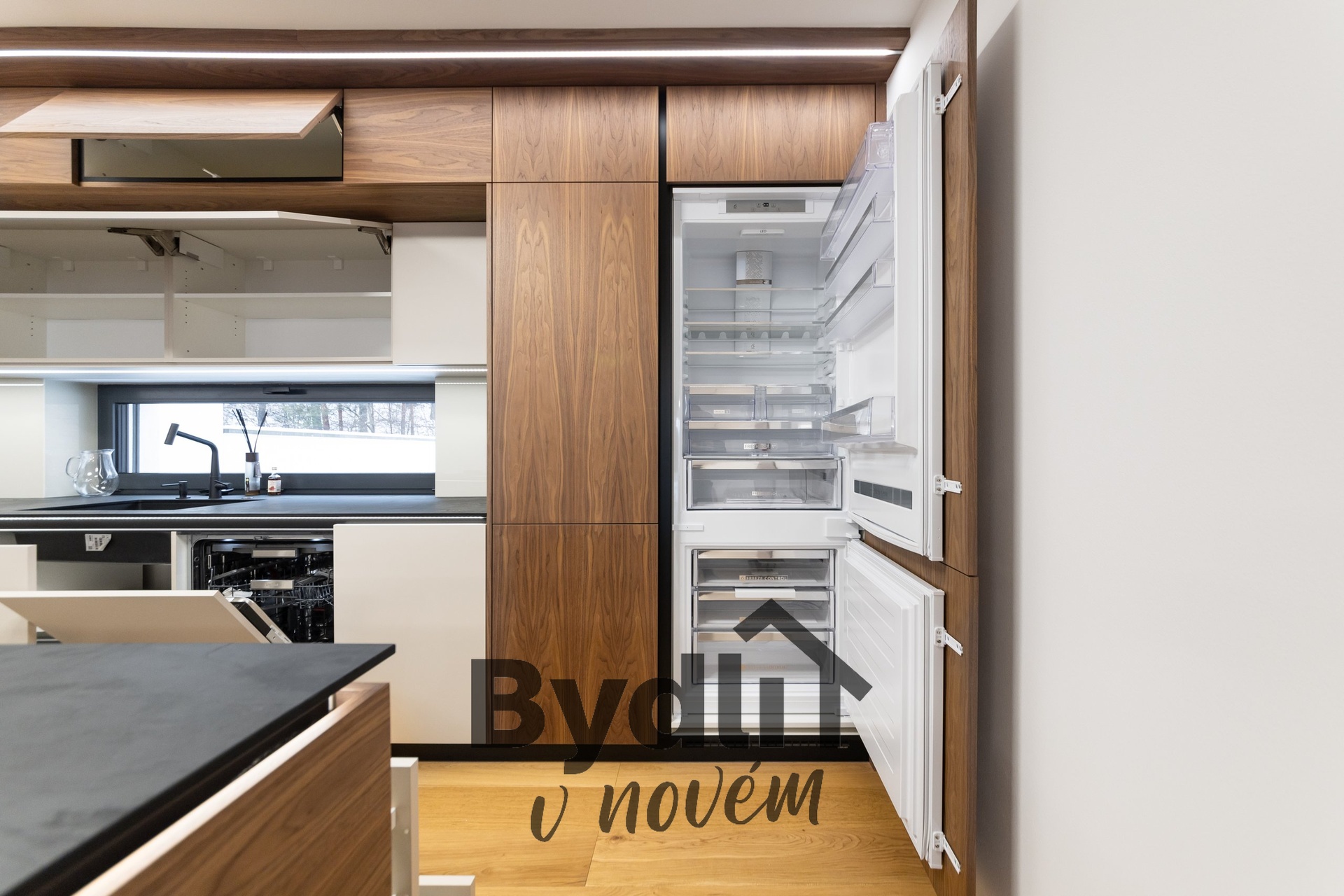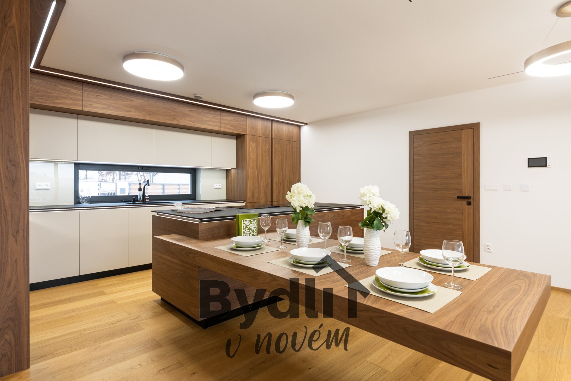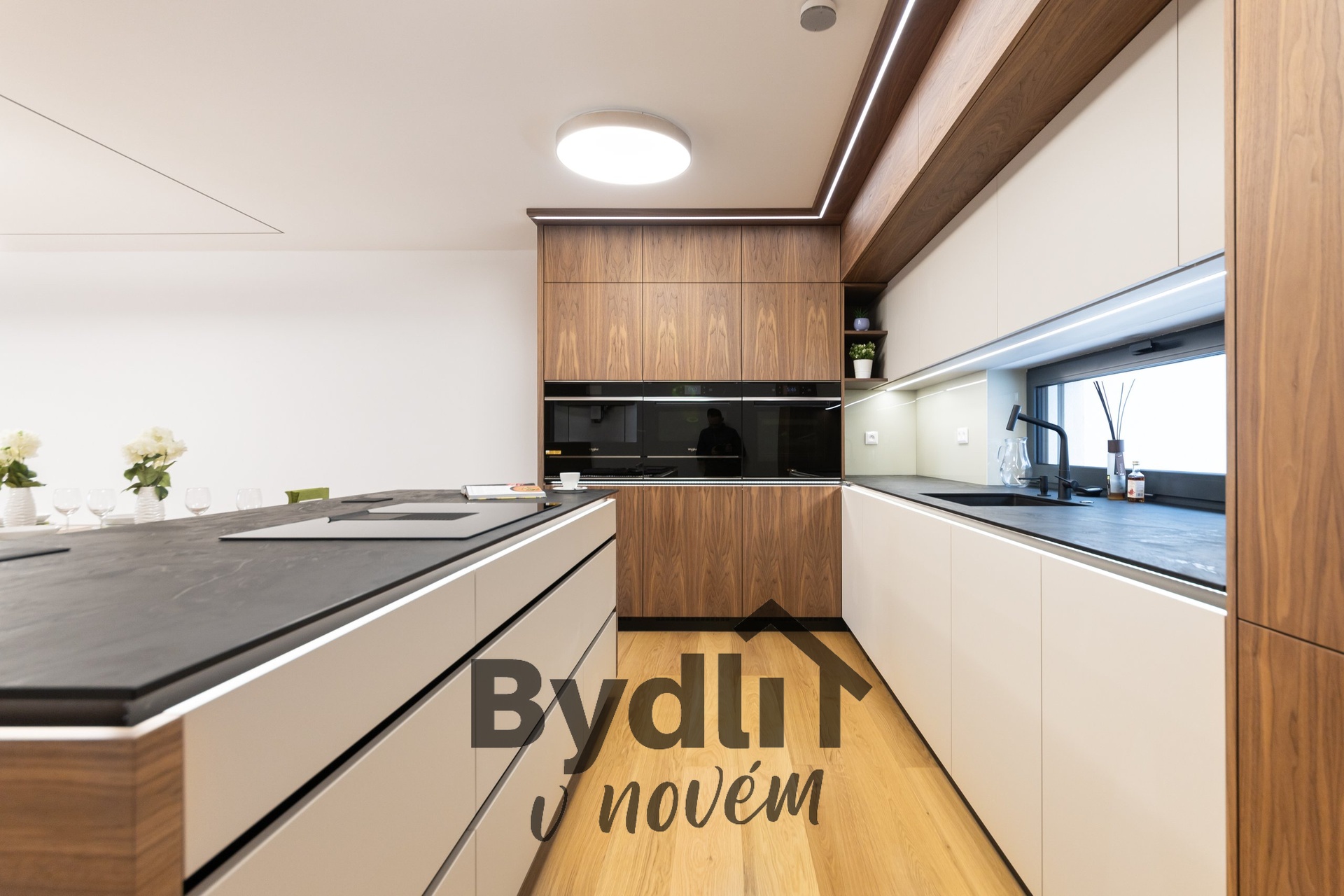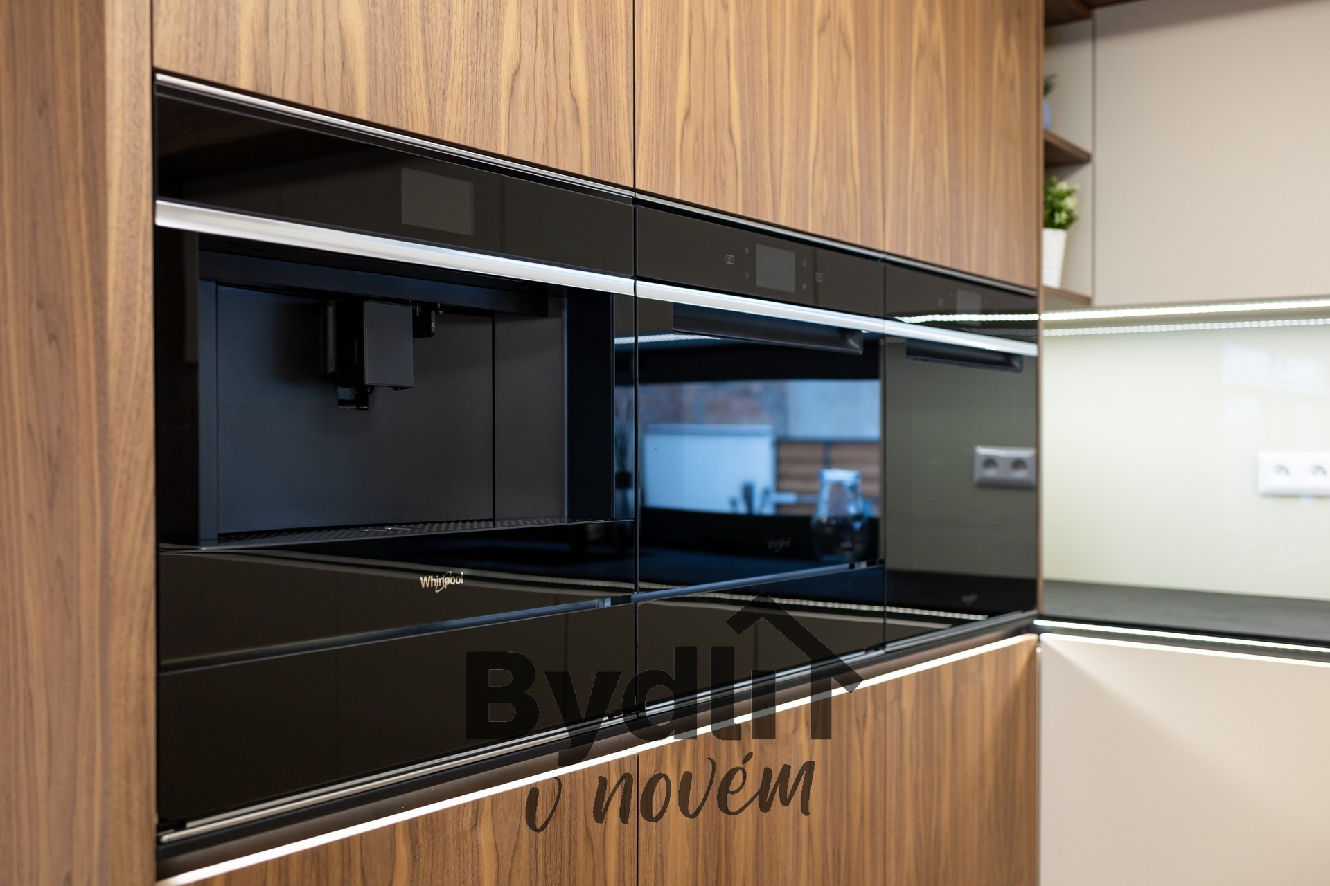 Kuchyňská linka s vestavěnými spotřebiči nejvyšší řady Whirlpool, včetně integrovaného kávovaru, výhřevných zásuvek a lednice o šířce 70cm. Součástí je praktický kuchyňský ostrůvek i designový jídelní stůl pro maximální komfort stolování a vaření.