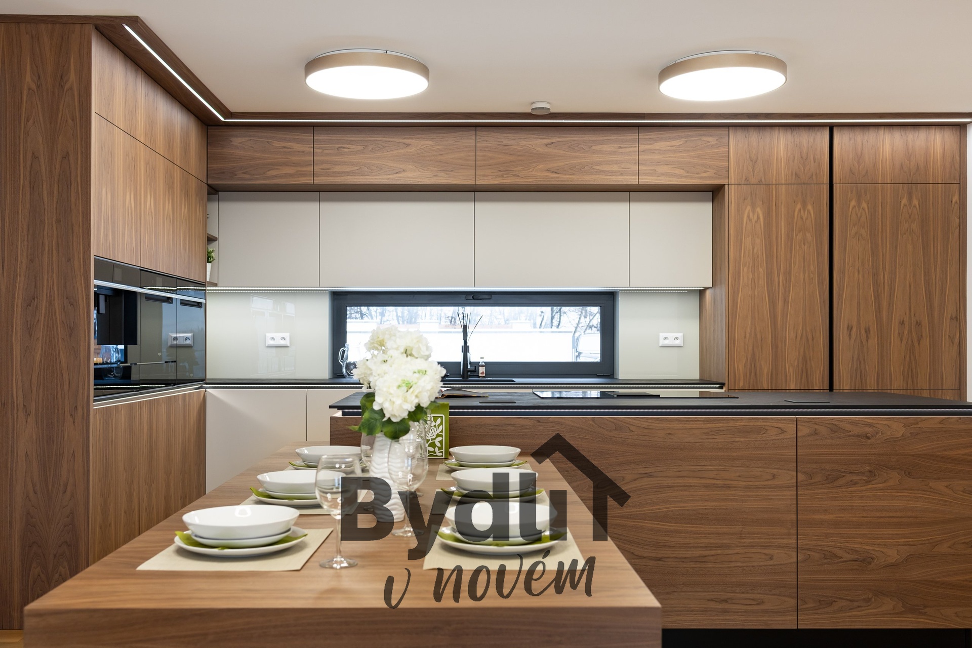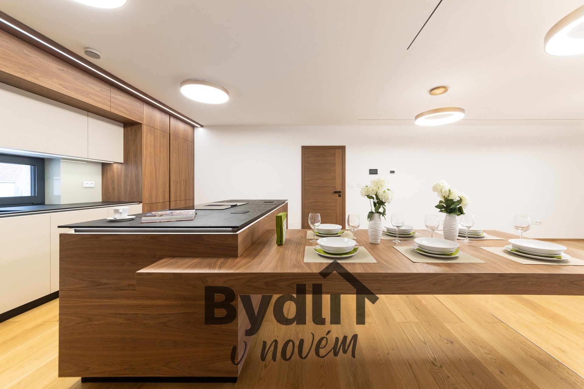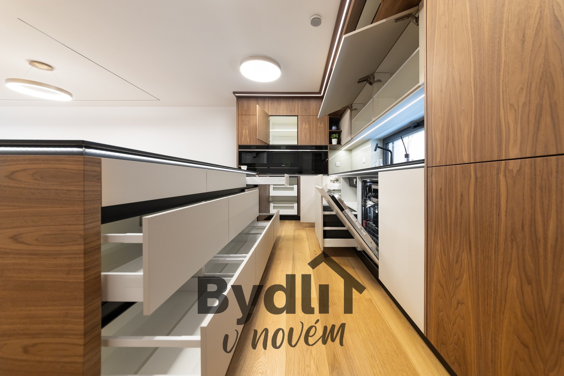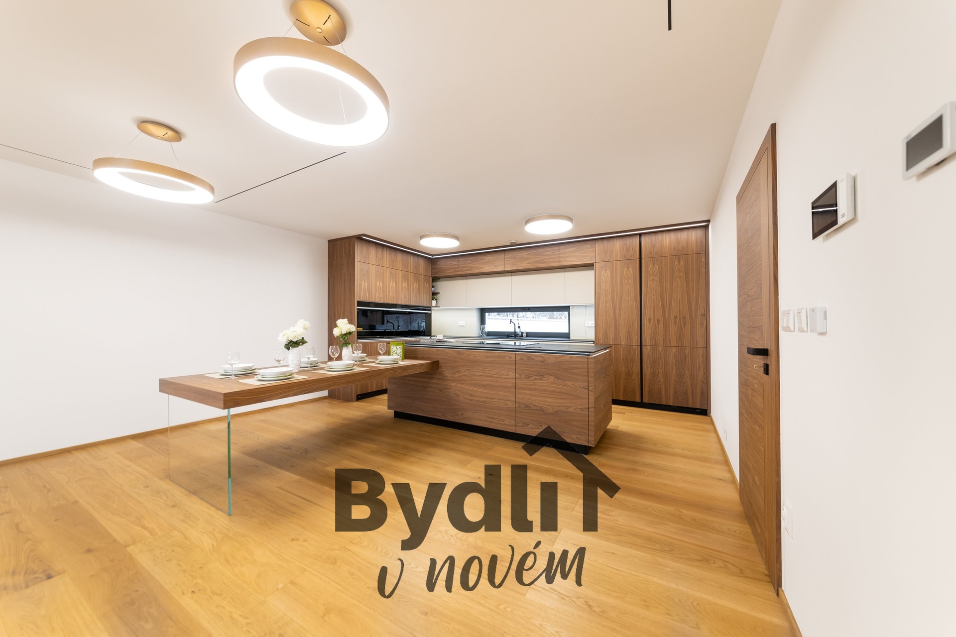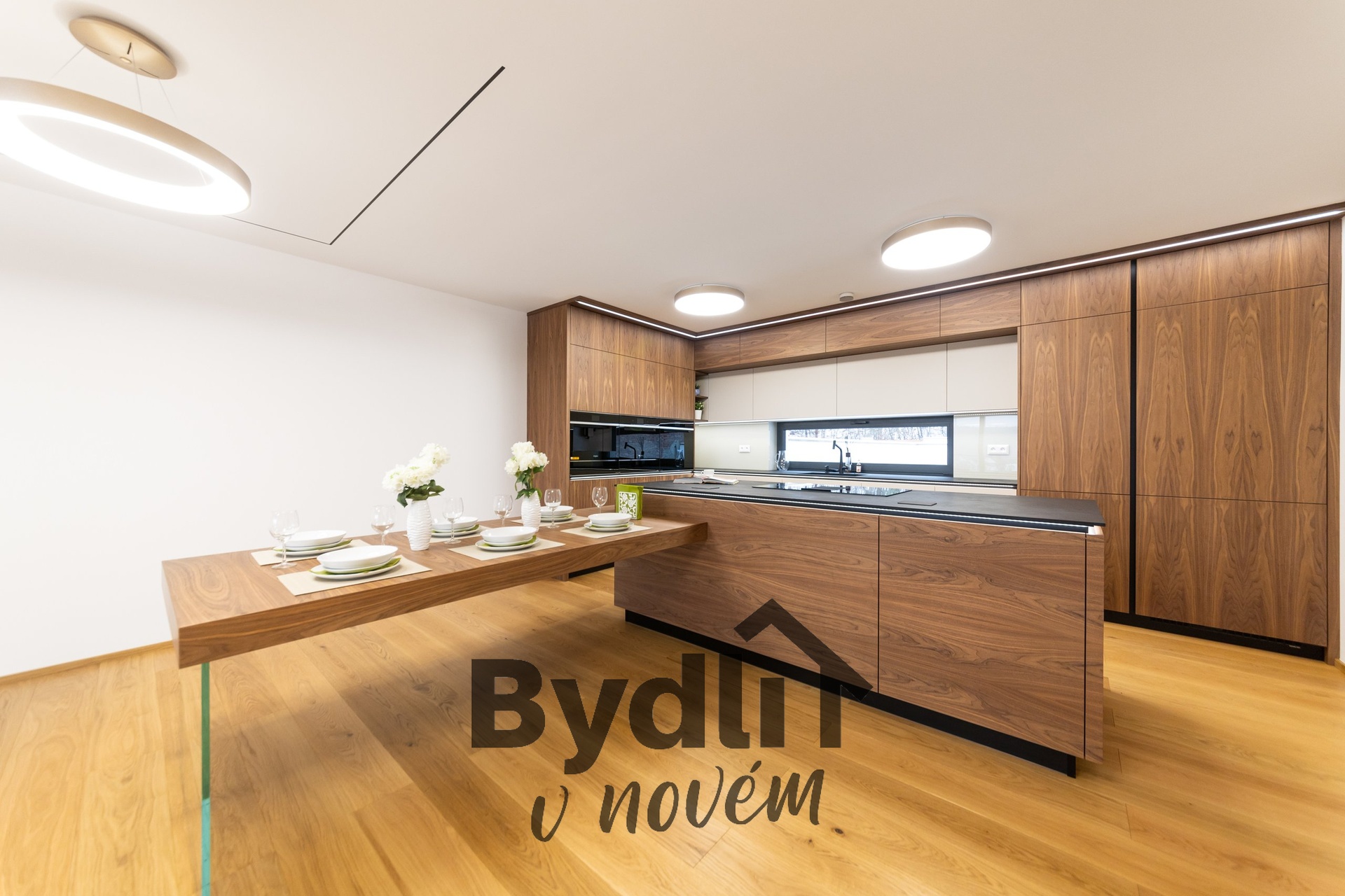 Kuchyňská linka s vestavěnými spotřebiči nejvyšší řady Whirlpool, včetně integrovaného kávovaru, výhřevných zásuvek a lednice o šířce 70cm. Součástí je praktický kuchyňský ostrůvek i designový jídelní stůl pro maximální komfort stolování a vaření.