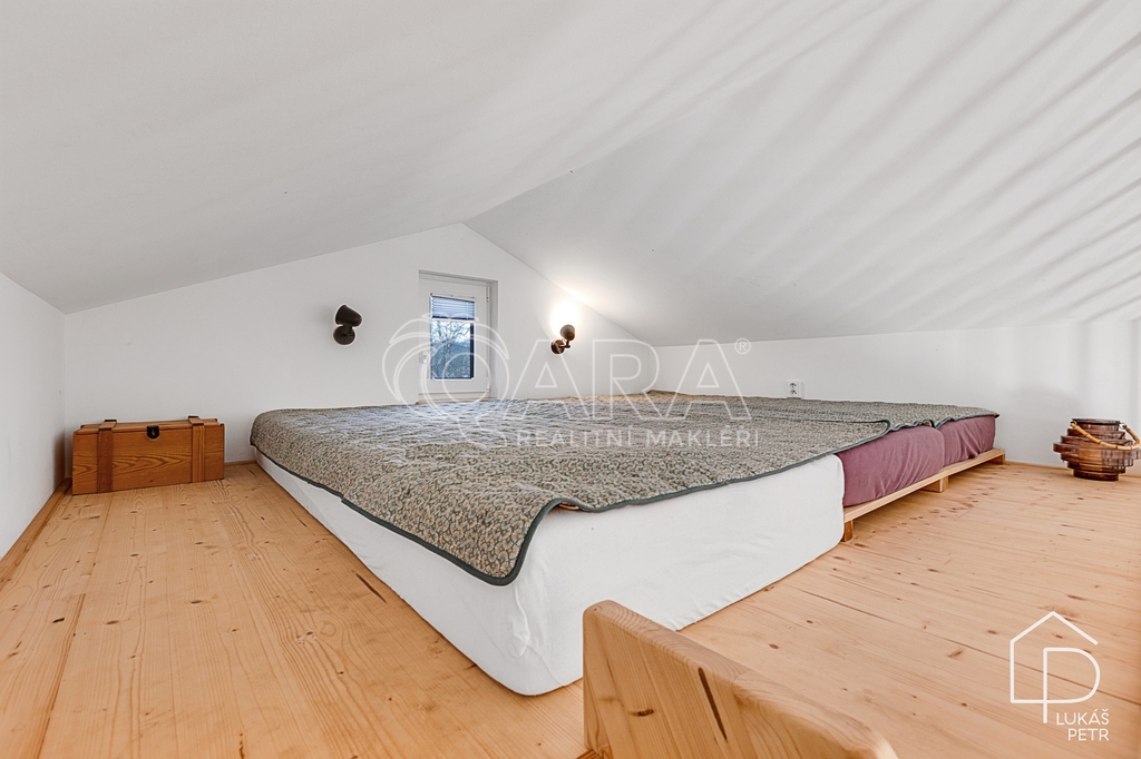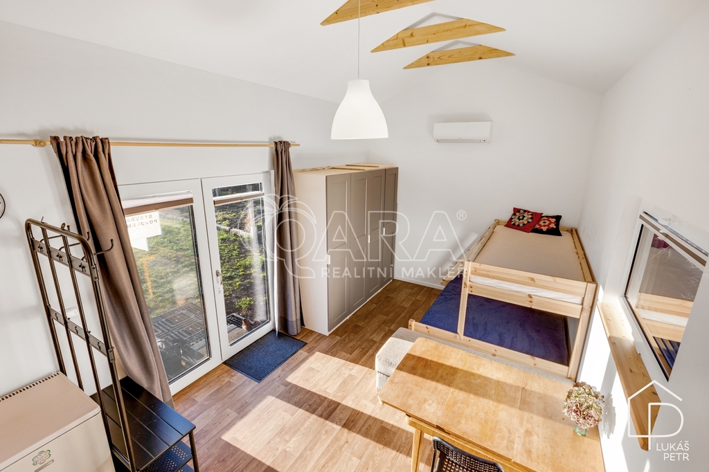 Celoroční tiny house s mezipatrem, který není řešený jako sezónní chatka, ale jako poctivě postavená stavba s normální skladbou konstrukcí a technikou, která dává smysl i pro dlouhodobé užívání. Dům má délku 8 metrů, zastavěnou plochu 28 m² a díky mezipatru vychází užitná plocha zhruba na 32 m². Půdorys je navržený účelně a interiér je využitý do posledního metru. Dům je starý zhruba jeden rok a je ve stavu téměř novostavby.