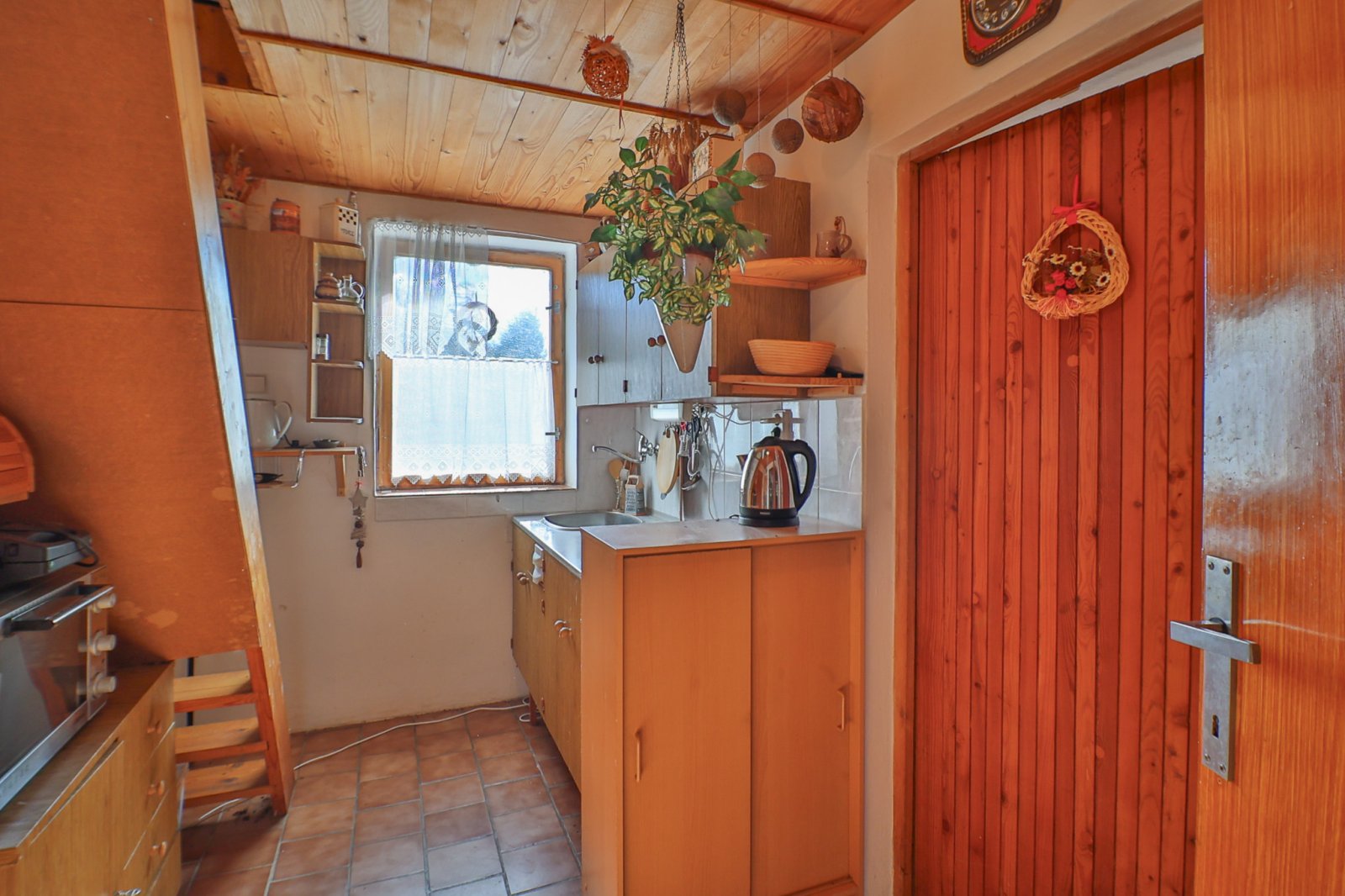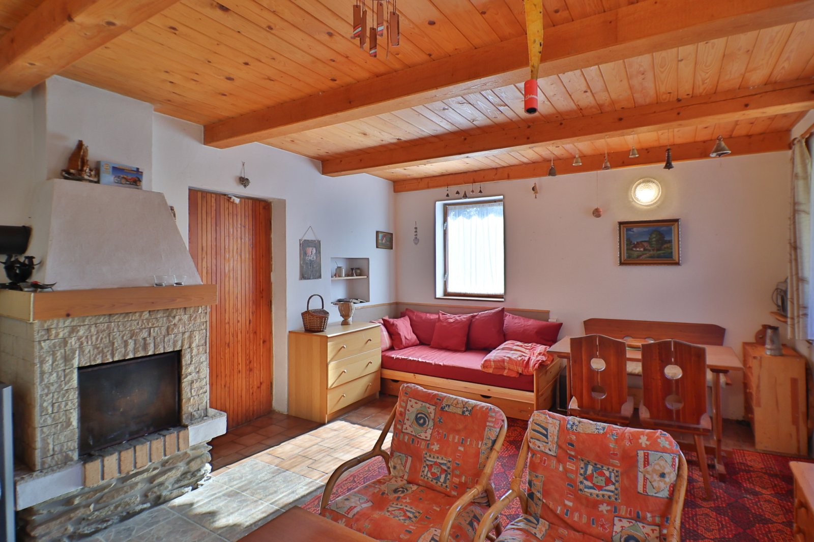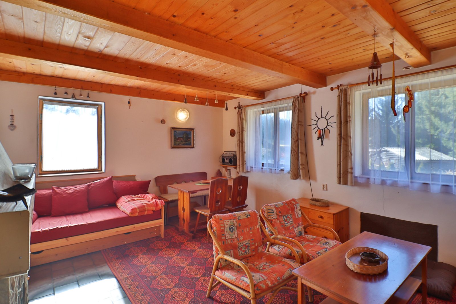 Přízemí: Praktická vstupní předsíň (veranda) vede do prostorného obývacího pokoje, kterému dominuje krb, dále je vytápěno kamny na TP. Na obývací část plynule navazuje kuchyňský kout. Součástí přízemí je také koupelna se sprchovým koutem a samostatná toaleta.